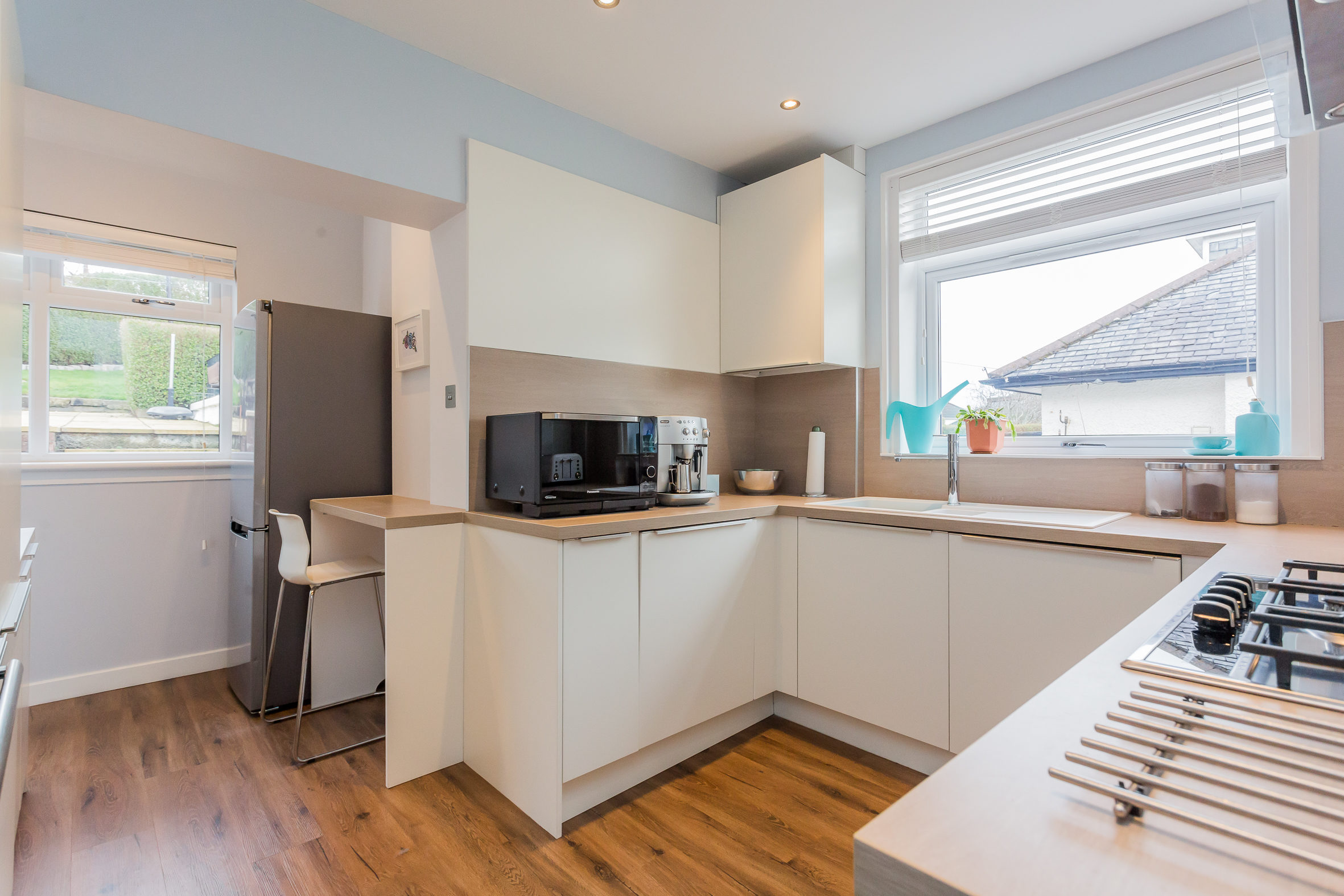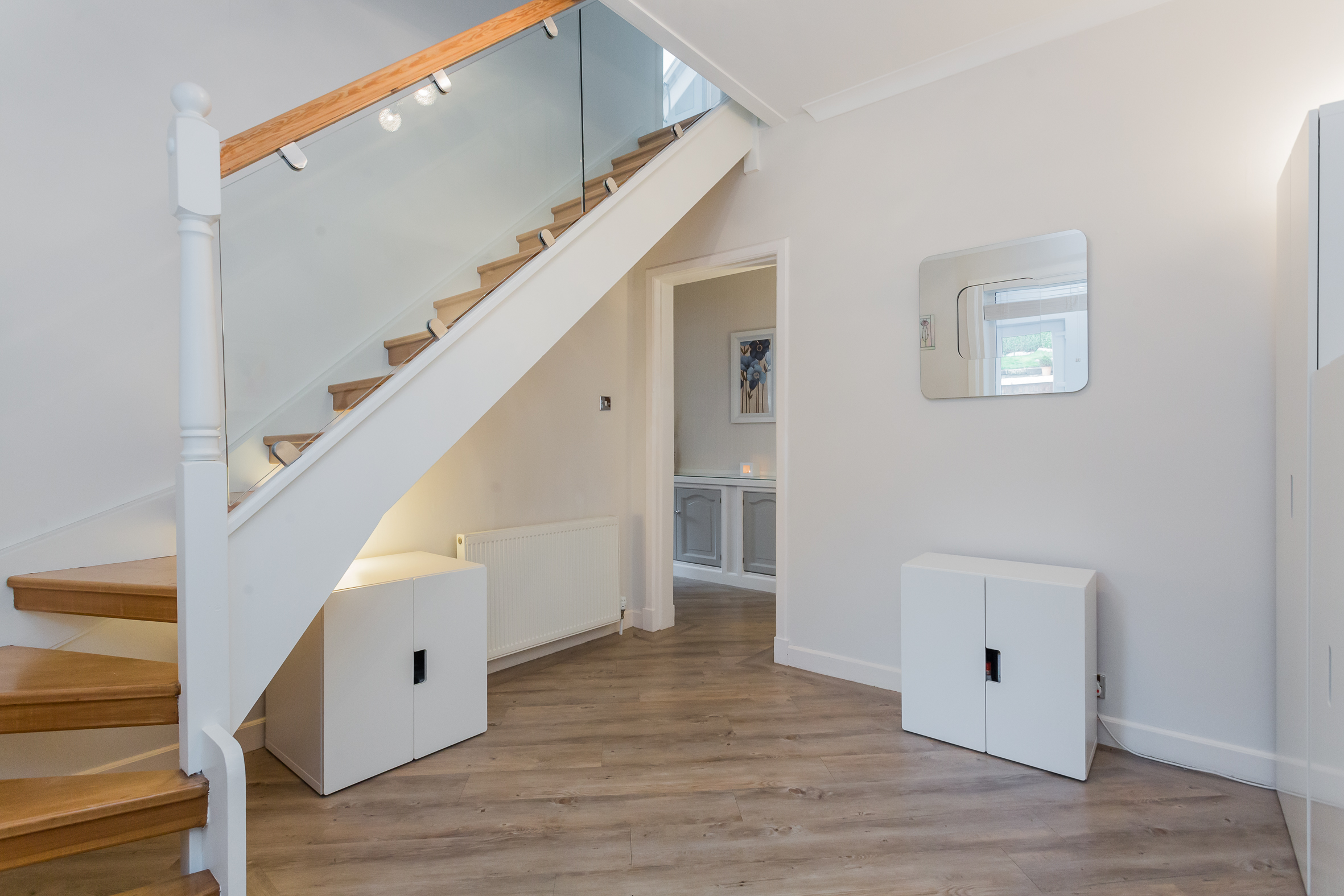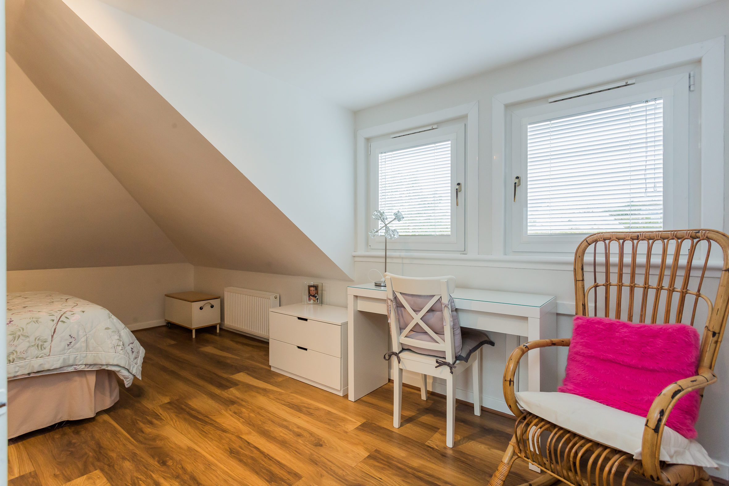 The entrance vestibule opens to the bright, welcoming reception hallway. The principal living room is at the front of the property and has a bay window, gas fire and fabulous view. There is a sitting room which is a warm and inviting space. Double doors lead to the dining room at the rear which could easily be used as a garden room overlooking the rear gardens. Skylight windows flood this space with light. There is a stylish, modern kitchen with a selection of fitted storage units (including a space saving larder) and good quality appliances which include oven, hob, dishwasher, washing machine and fridge/freezer. On the ground level there is a sleek, shower room which is tiled and has a three-piece suite. Bedroom one is also on the ground floor and is an elegant, bay windowed room to front of the property with fitted wardrobes. The family room offers flexible use and has a stair to the upper level. There are two further double bedrooms on the upper floor which both have dormer windows. The home office/bedroom 4 is also on this floor and has a stunning view. The bathroom completes the accommodation and has a four-piece suite and skylight window.