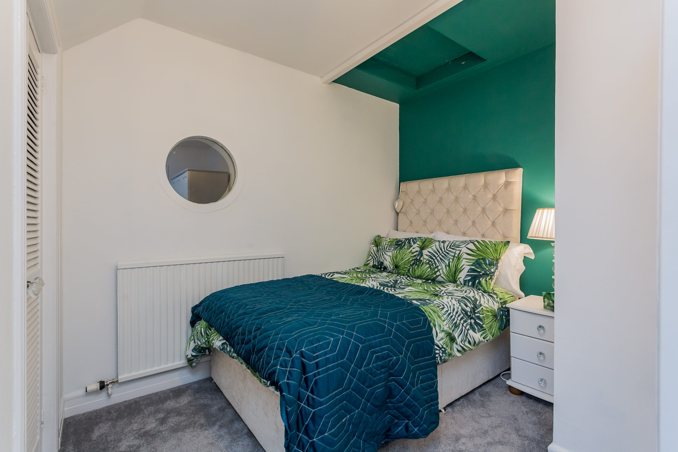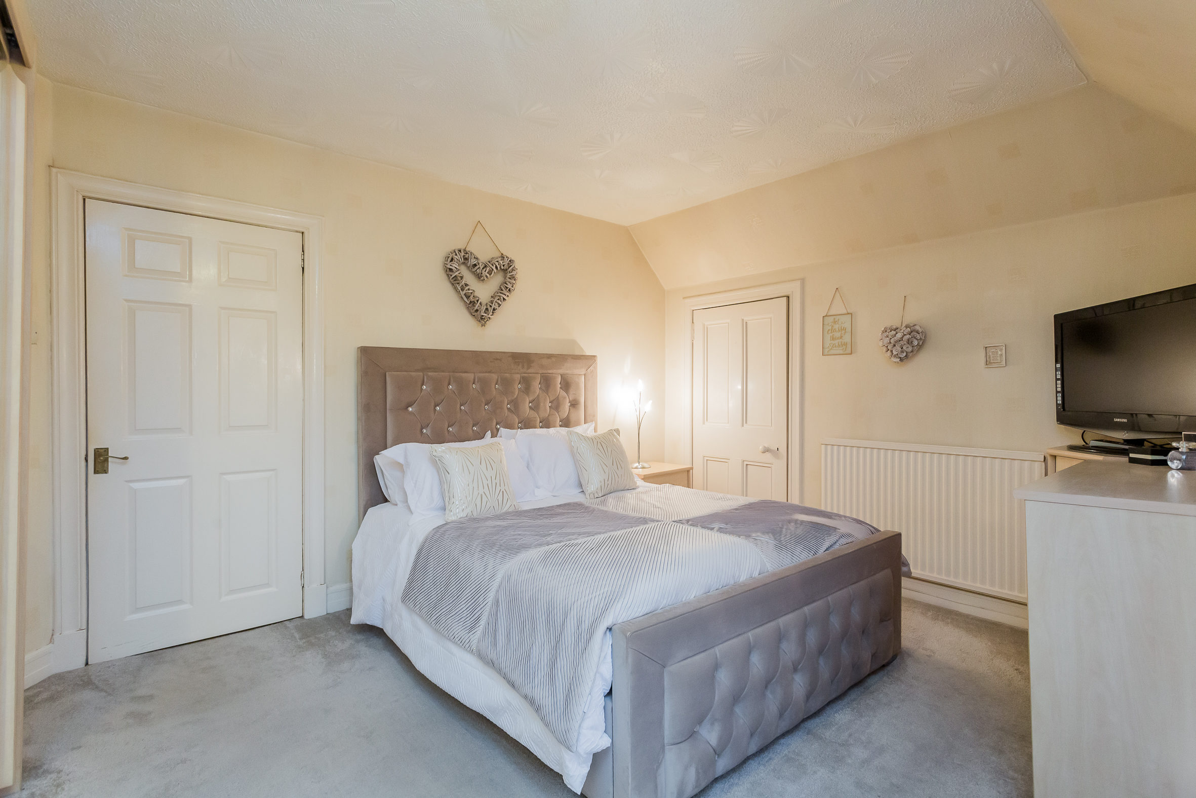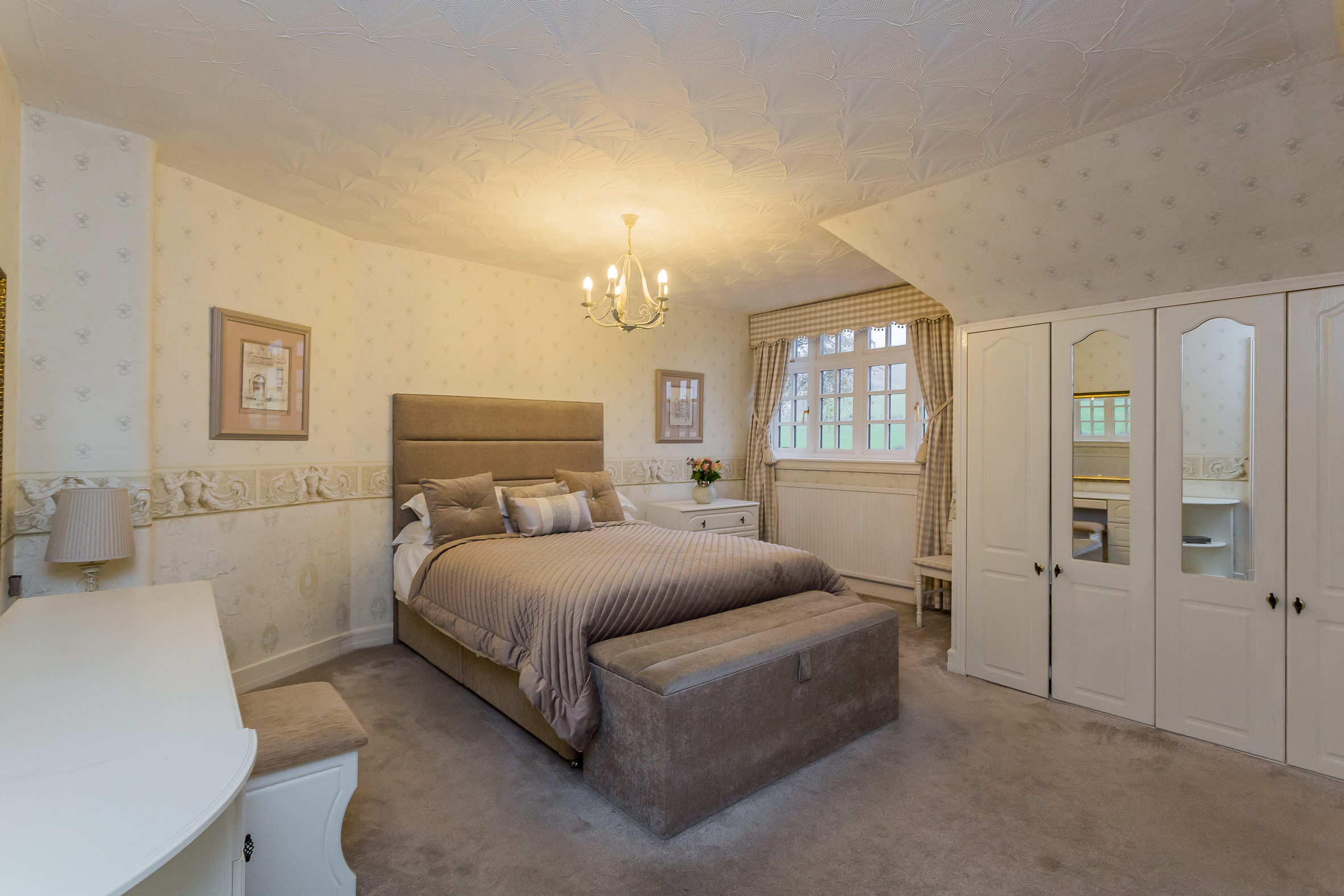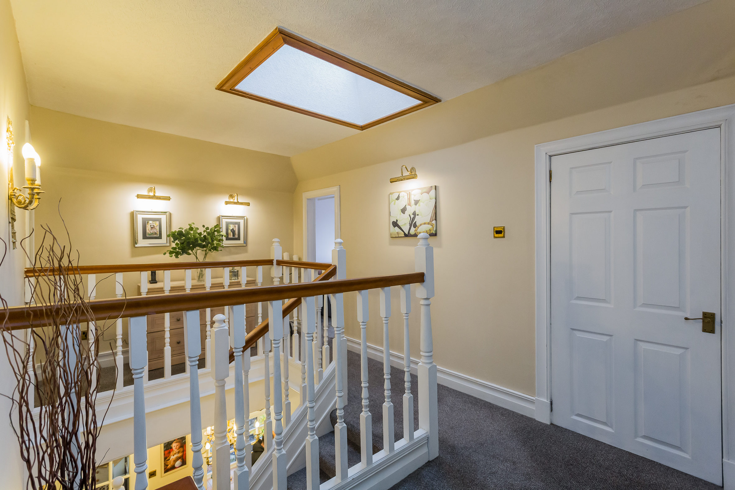 A carpeted stairwell leads to four bedrooms, one of which has an en-suite bathroom and each of the bedrooms has built-in wardrobes, eave storage or both.