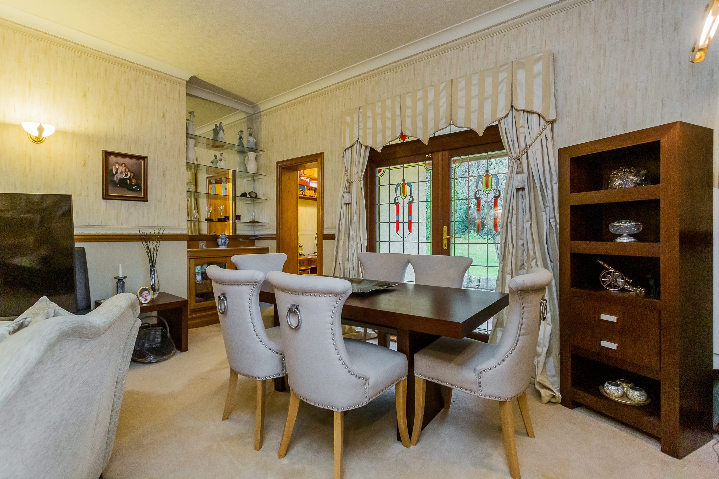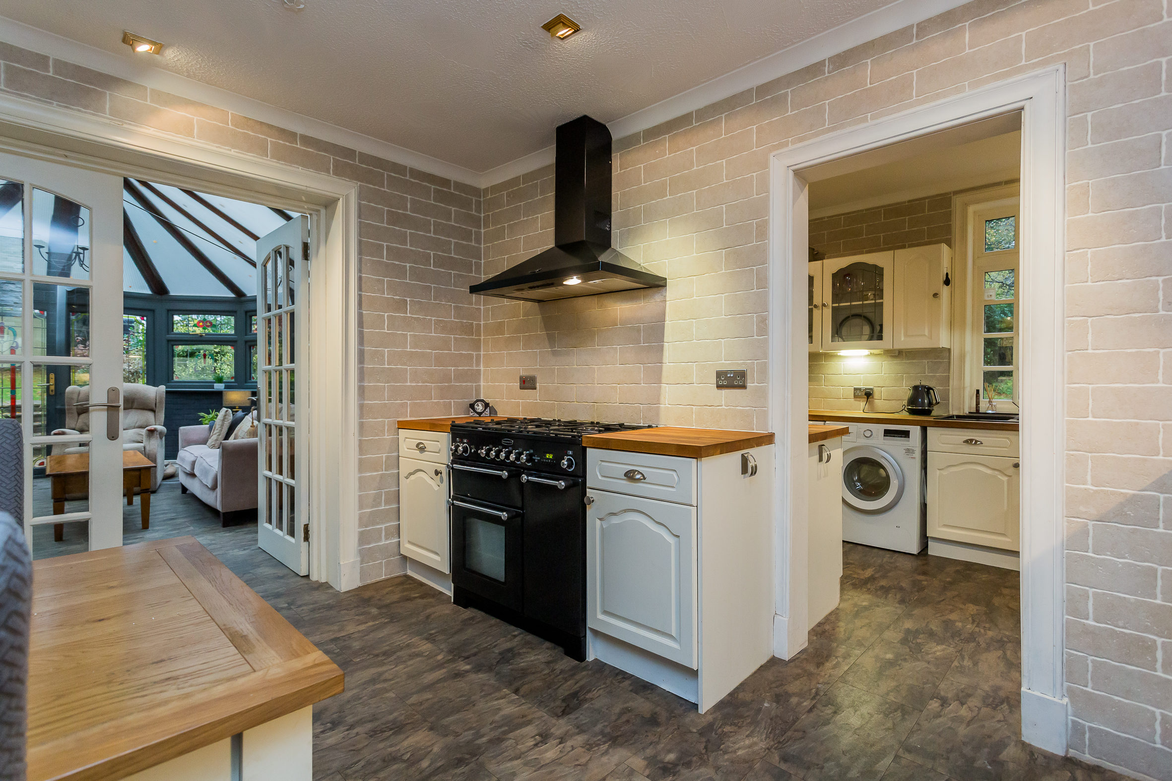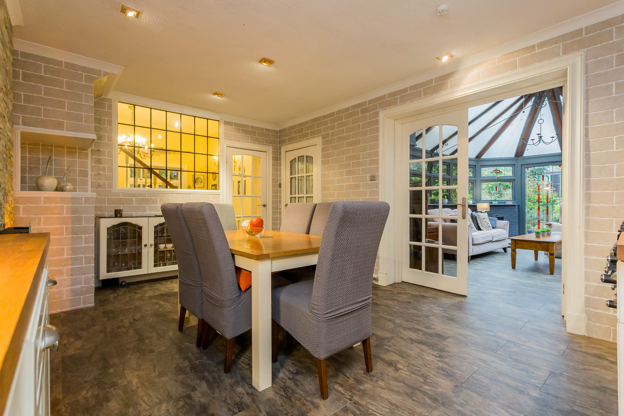 The dining kitchen is to the rear and has a fantastic sized utility room with door to the rear patio area. The kitchen has ample wall & base units with a freestanding ‘Rangemaster’ range and space for a dining table in the centre. From here there are French doors leading to a sunroom that again has doors to the patio area and gardens.