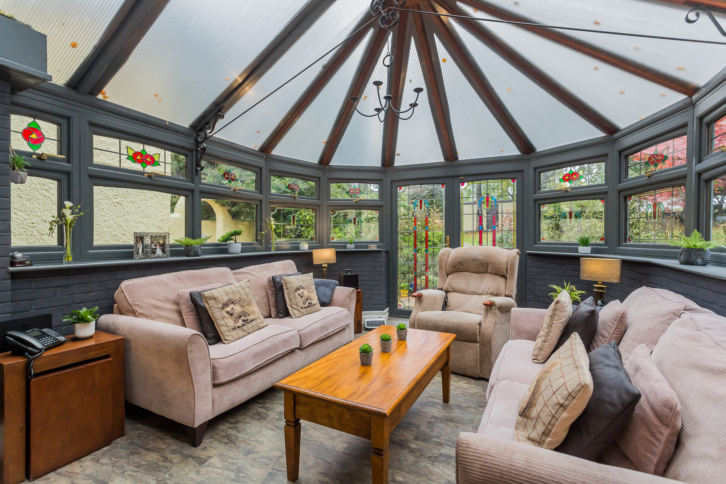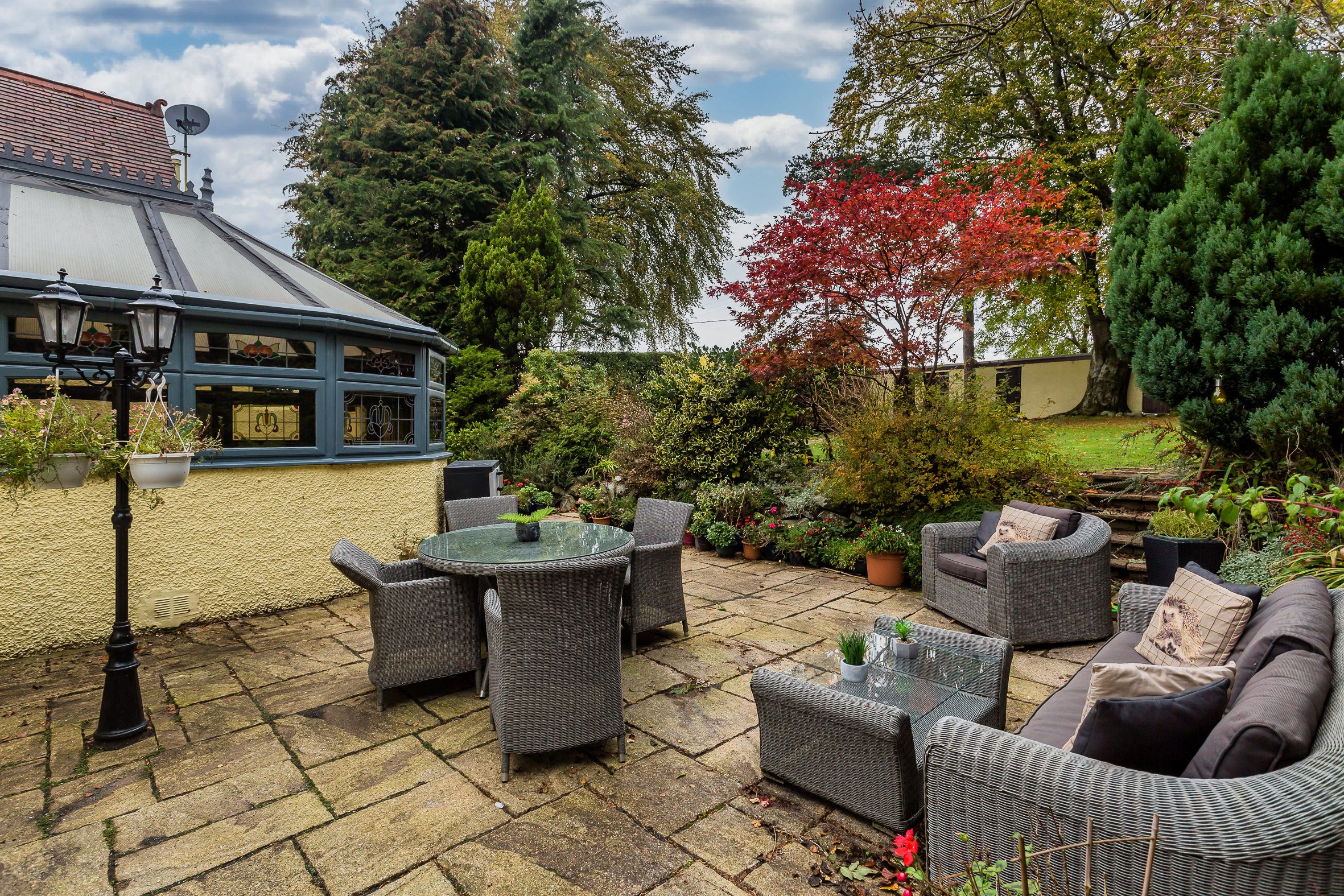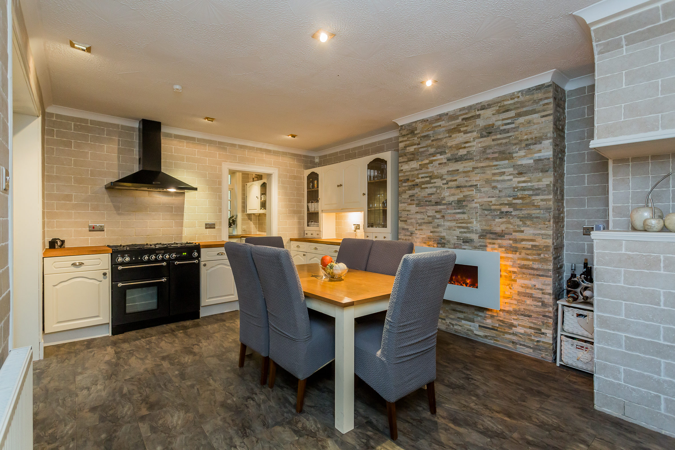 The dining kitchen is to the rear and has a fantastic sized utility room with door to the rear patio area. The kitchen has ample wall & base units with a freestanding ‘Rangemaster’ range and space for a dining table in the centre. From here there are French doors leading to a sunroom that again has doors to the patio area and gardens.