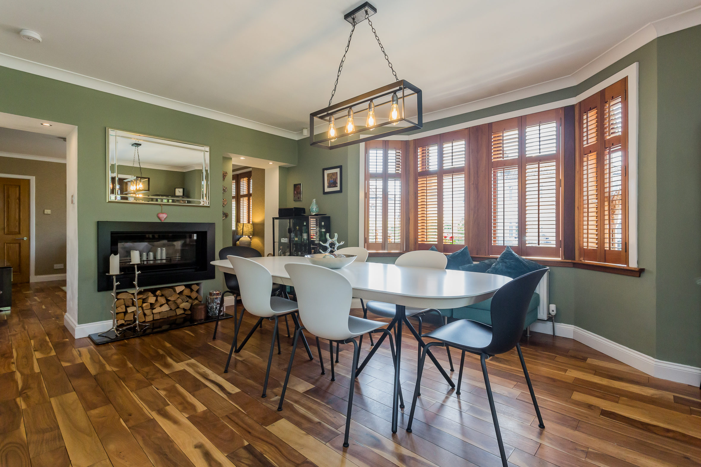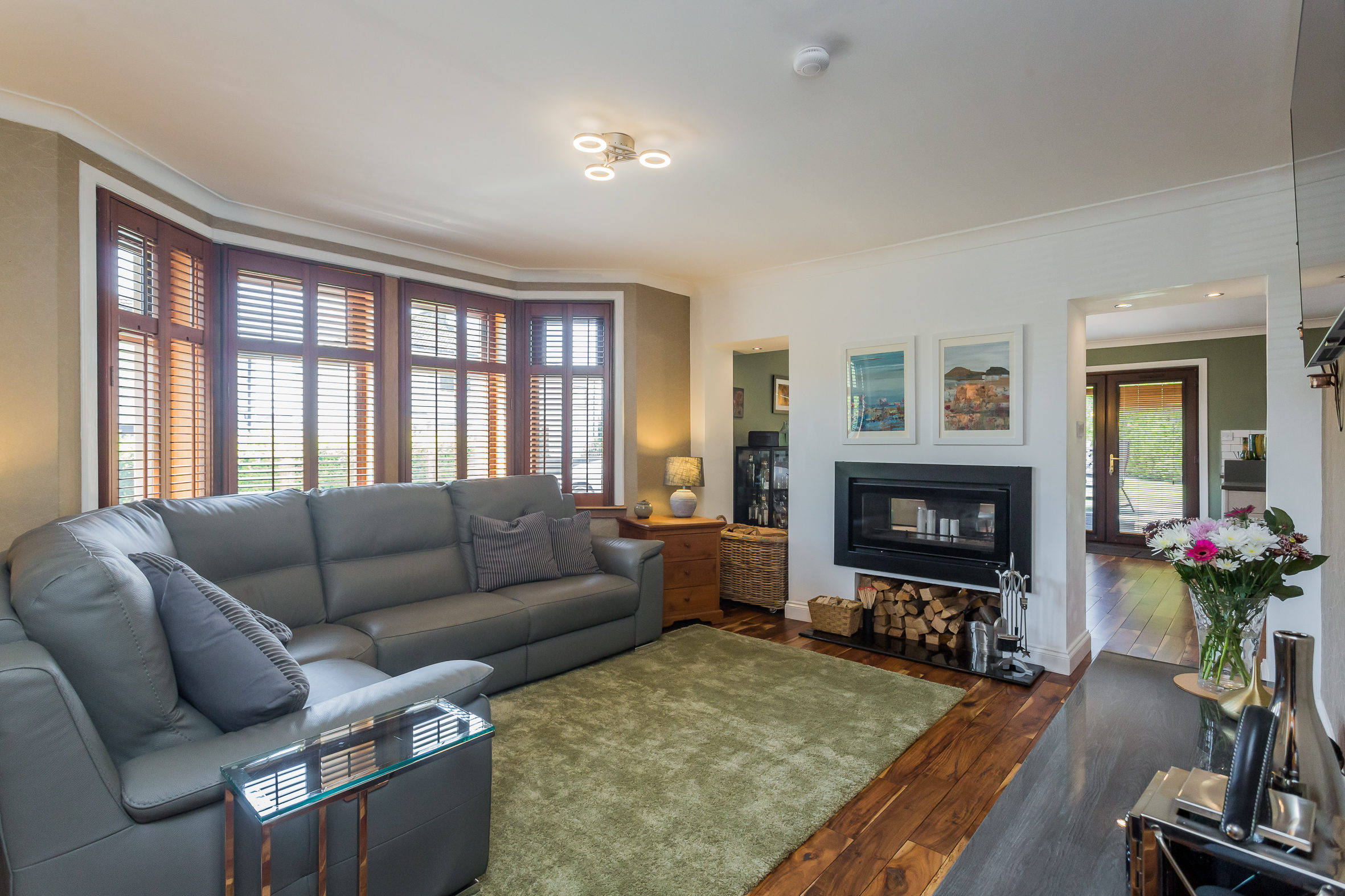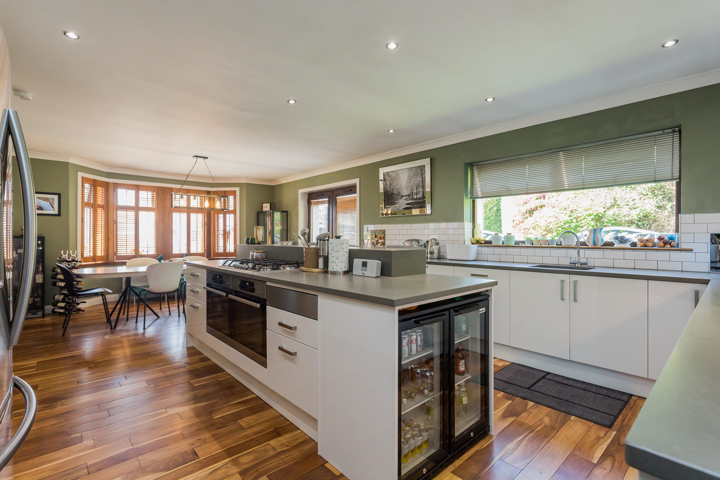 There is a broad and welcoming reception hallway with access to a home office. The principal lounge is to the front of the property and has a bay window and a gas fire. The living room is also to the front of the property and accessed from the hallway. This is a beautiful room with Walnut, hardwood flooring that extends to the kitchen area. One of the most striking things about this room is the duplex wood burning stove that is enjoyed by the living room and the dining area in the kitchen. The semi open plan layout makes the kitchen and living room a brilliant social space for family life and entertaining. The kitchen is an immediately impressive room which runs the length of the house and has kitchen units and an island with contemporary polished concrete worktops. There is a breakfast bar on the island and appliances in the kitchen include a coffee machine, wine fridge, gas hob, double oven, dishwasher and American style fridge freezer. From the dining area there are French doors which lead to the garden at the side of the house. The utility room is an essential part of a family home and can be accessed from the kitchen. There is space for further appliances in here, an additional sink and back door to the garden. The main bedroom is on the ground level and has large, fitted wardrobes. Bedrooms two and three are also good sized double rooms and are on the upper level of the property. They both benefit from fitted storage and skylight windows. The property has two bathrooms; a tiled shower room on the upper level and a luxurious family bathroom on the ground level with a four piece suite including double sized shower cubicle, a double vanity unit, bath and WC.