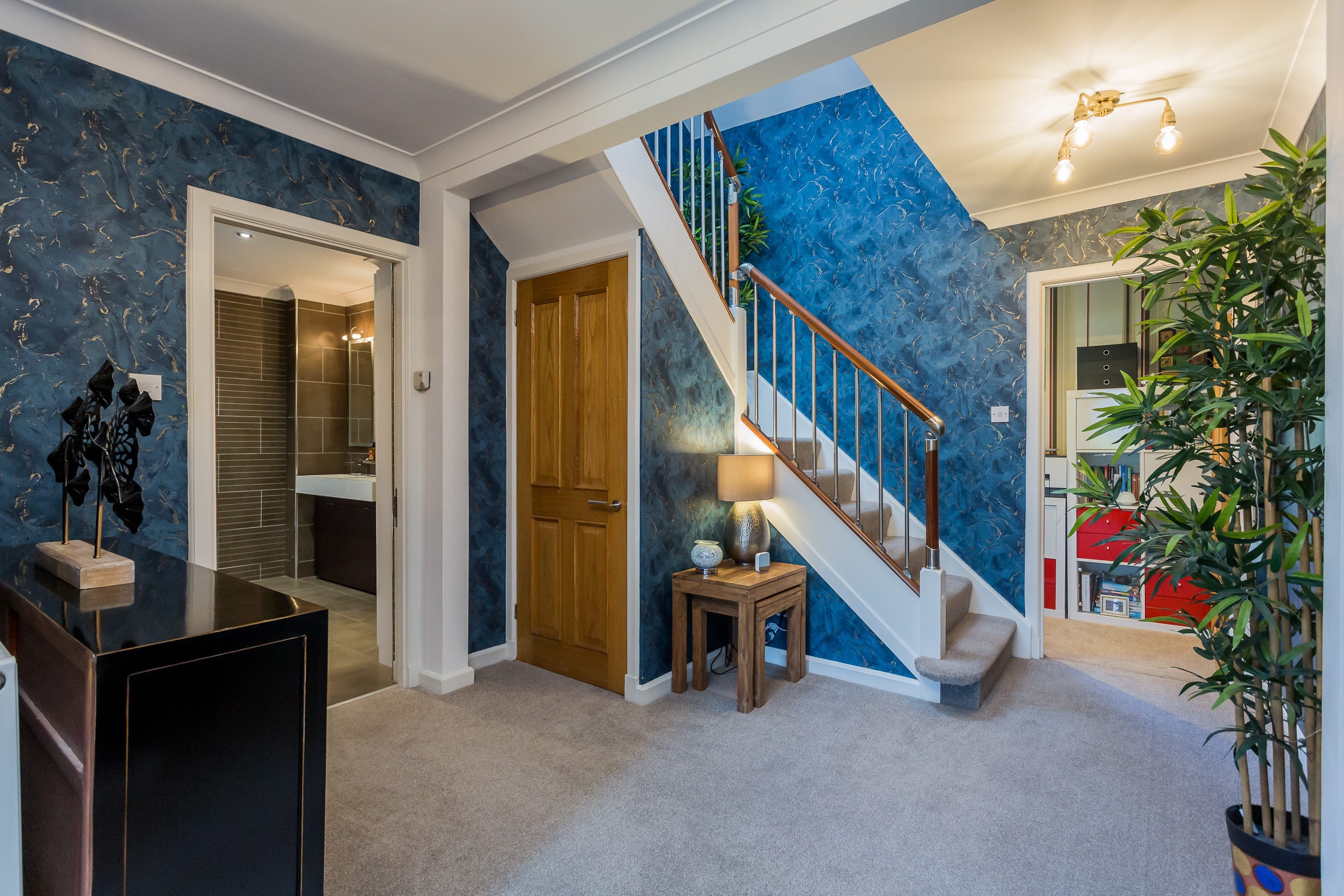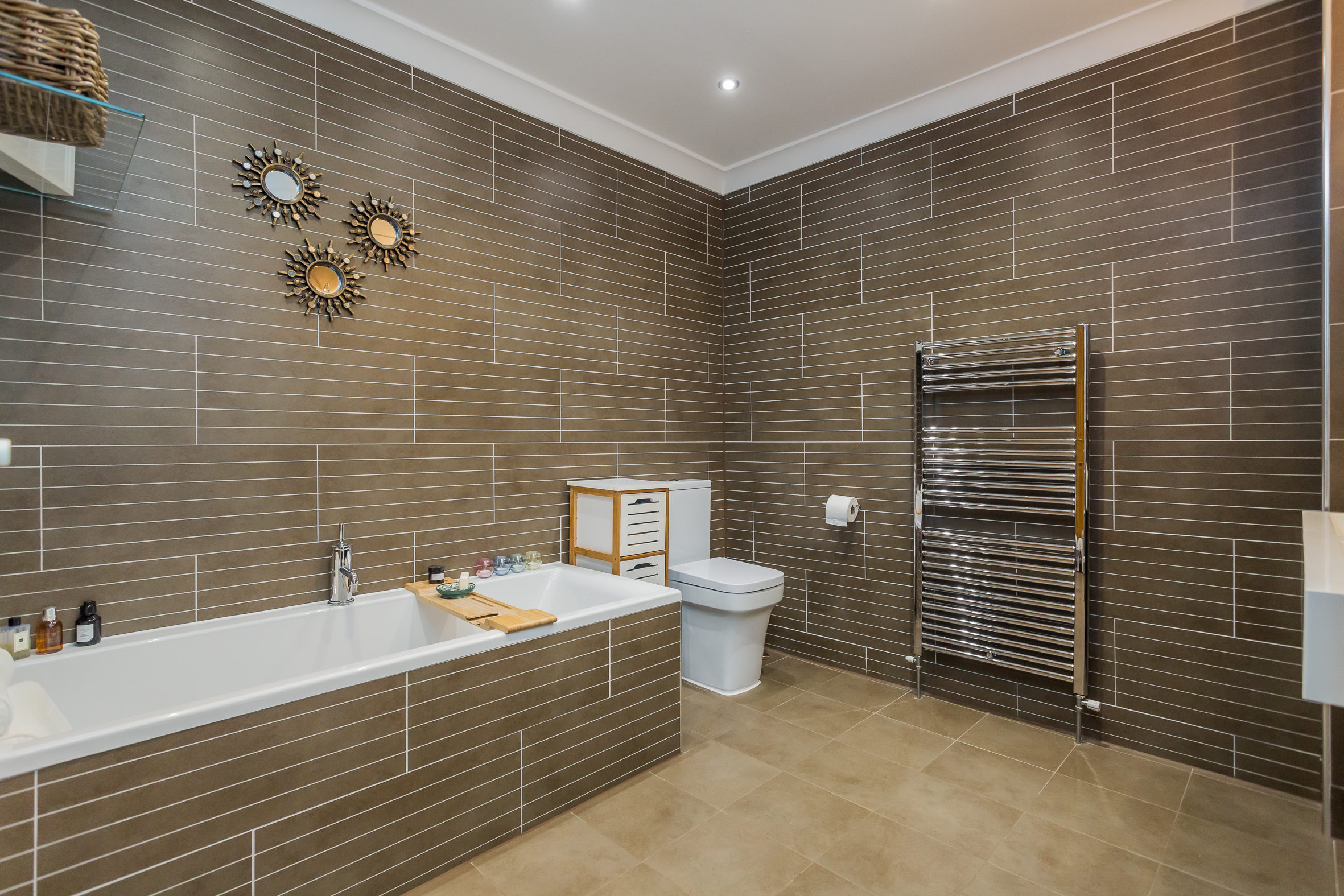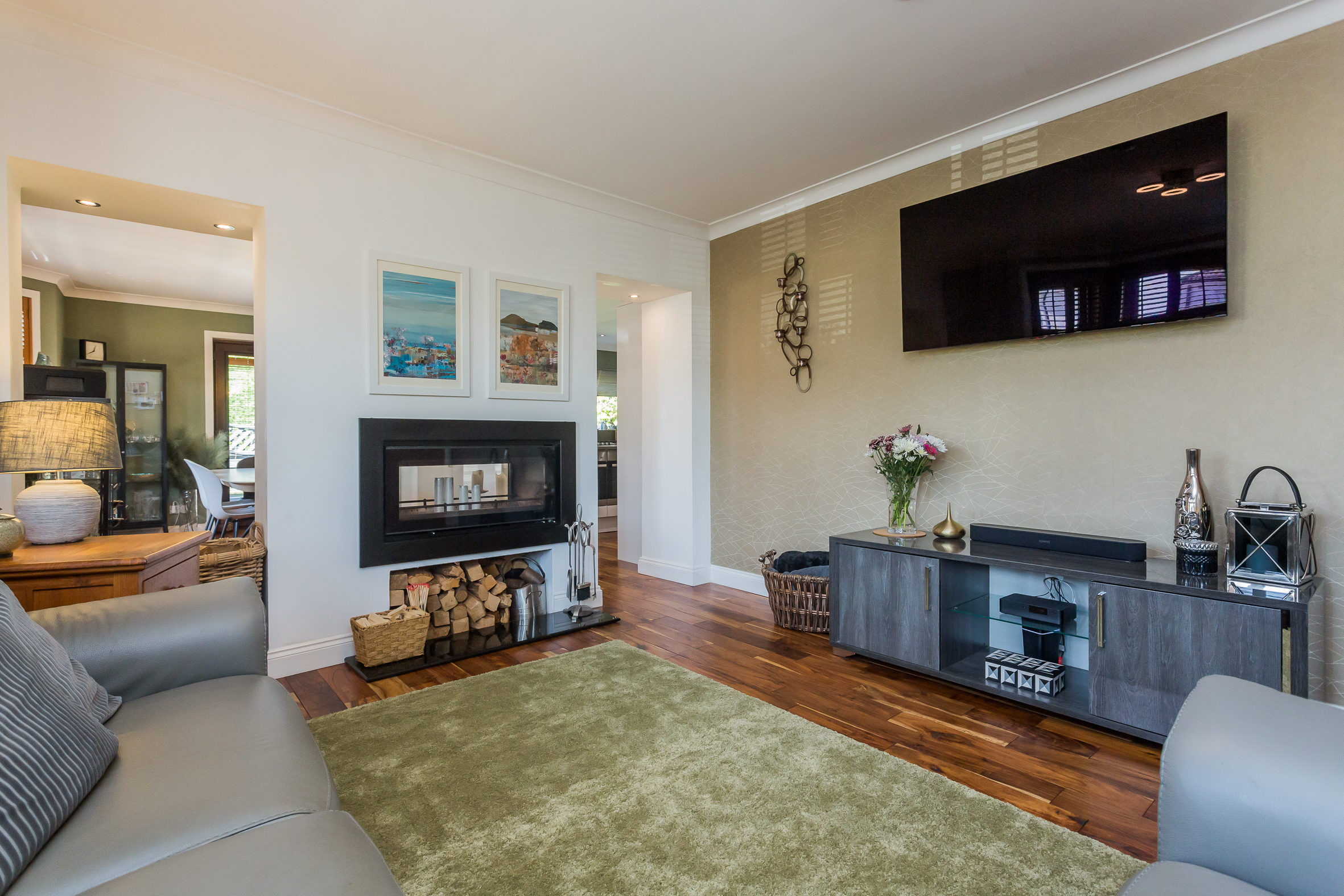 There is a broad and welcoming reception hallway with access to a home office. The principal lounge is to the front of the property and has a bay window and a gas fire. The living room is also to the front of the property and accessed from the hallway. This is a beautiful room with Walnut, hardwood flooring that extends to the kitchen area. One of the most striking things about this room is the duplex wood burning stove that is enjoyed by the living room and the dining area in the kitchen. The semi open plan layout makes the kitchen and living room a brilliant social space for family life and entertaining. The kitchen is an immediately impressive room which runs the length of the house and has kitchen units and an island with contemporary polished concrete worktops. There is a breakfast bar on the island and appliances in the kitchen include a coffee machine, wine fridge, gas hob, double oven, dishwasher and American style fridge freezer. From the dining area there are French doors which lead to the garden at the side of the house. The utility room is an essential part of a family home and can be accessed from the kitchen. There is space for further appliances in here, an additional sink and back door to the garden. The main bedroom is on the ground level and has large, fitted wardrobes. Bedrooms two and three are also good sized double rooms and are on the upper level of the property. They both benefit from fitted storage and skylight windows. The property has two bathrooms; a tiled shower room on the upper level and a luxurious family bathroom on the ground level with a four piece suite including double sized shower cubicle, a double vanity unit, bath and WC.