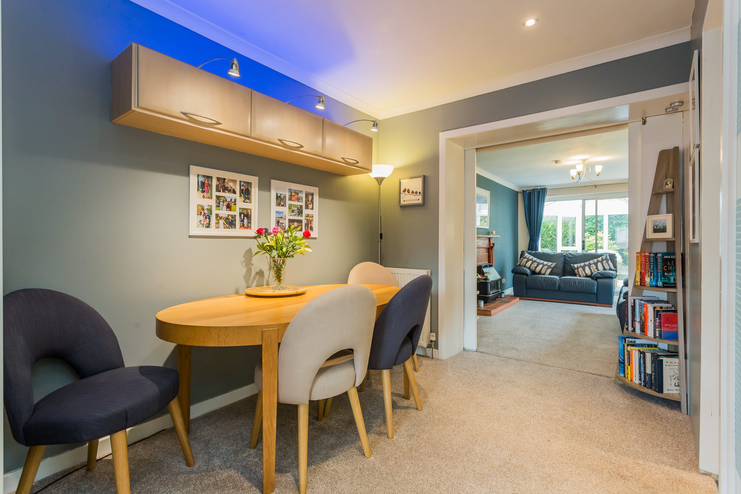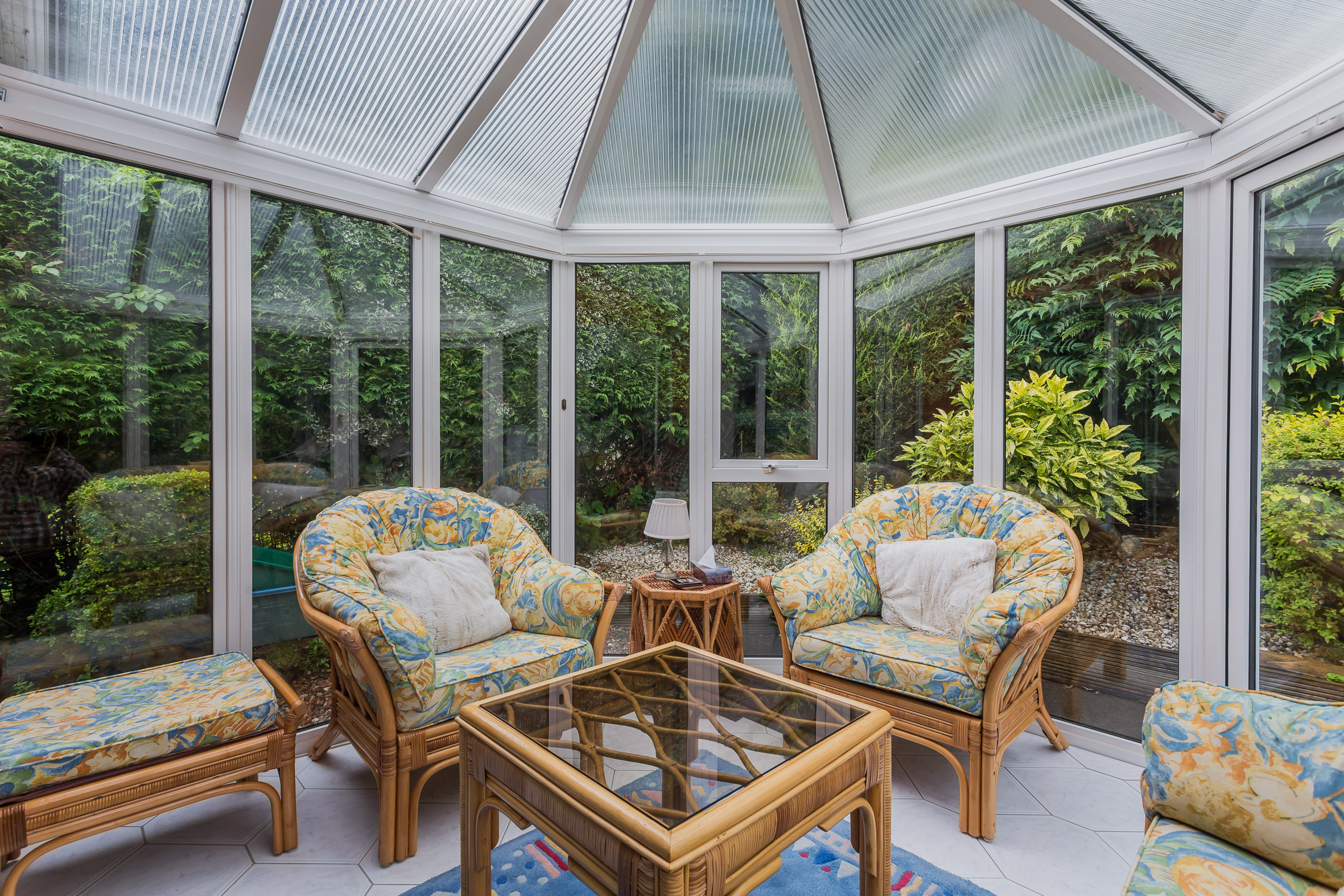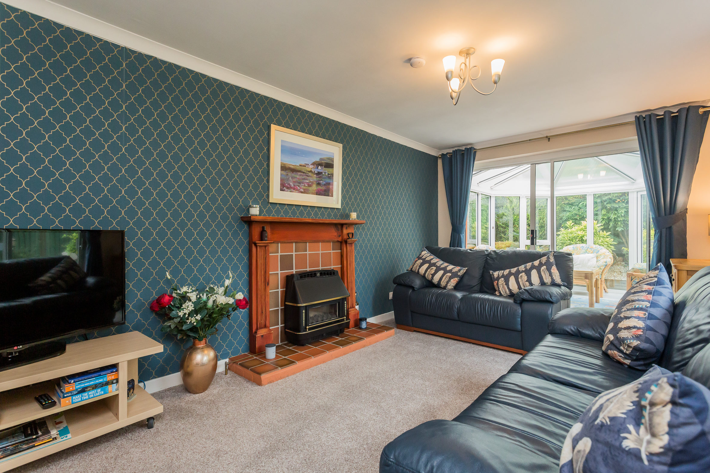 An entrance vestibule leads to the reception hallway with WC off. The front facing lounge has a feature fireplace with double doors leading to the dining room. Separating the dining room from the breakfast kitchen is a contemporary glass partition. The kitchen is of modern design with a breakfast bar for casual dining with a utility room off. Beyond the dining room is a set of sliding doors giving access to a further sitting room which in turn leads to the conservatory. Again, sliding doors lead to the landscaped gardens.