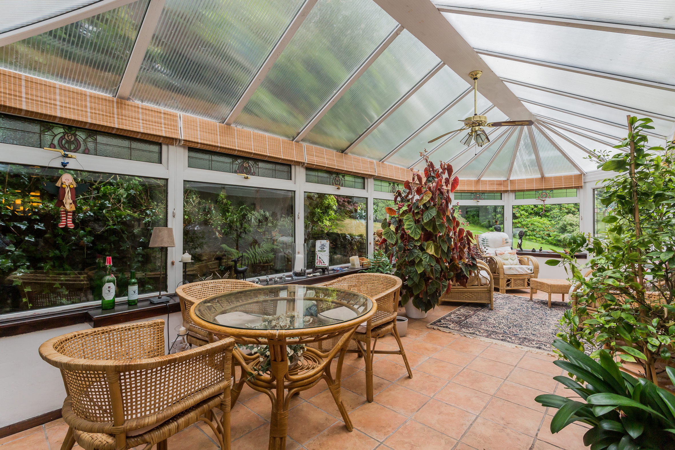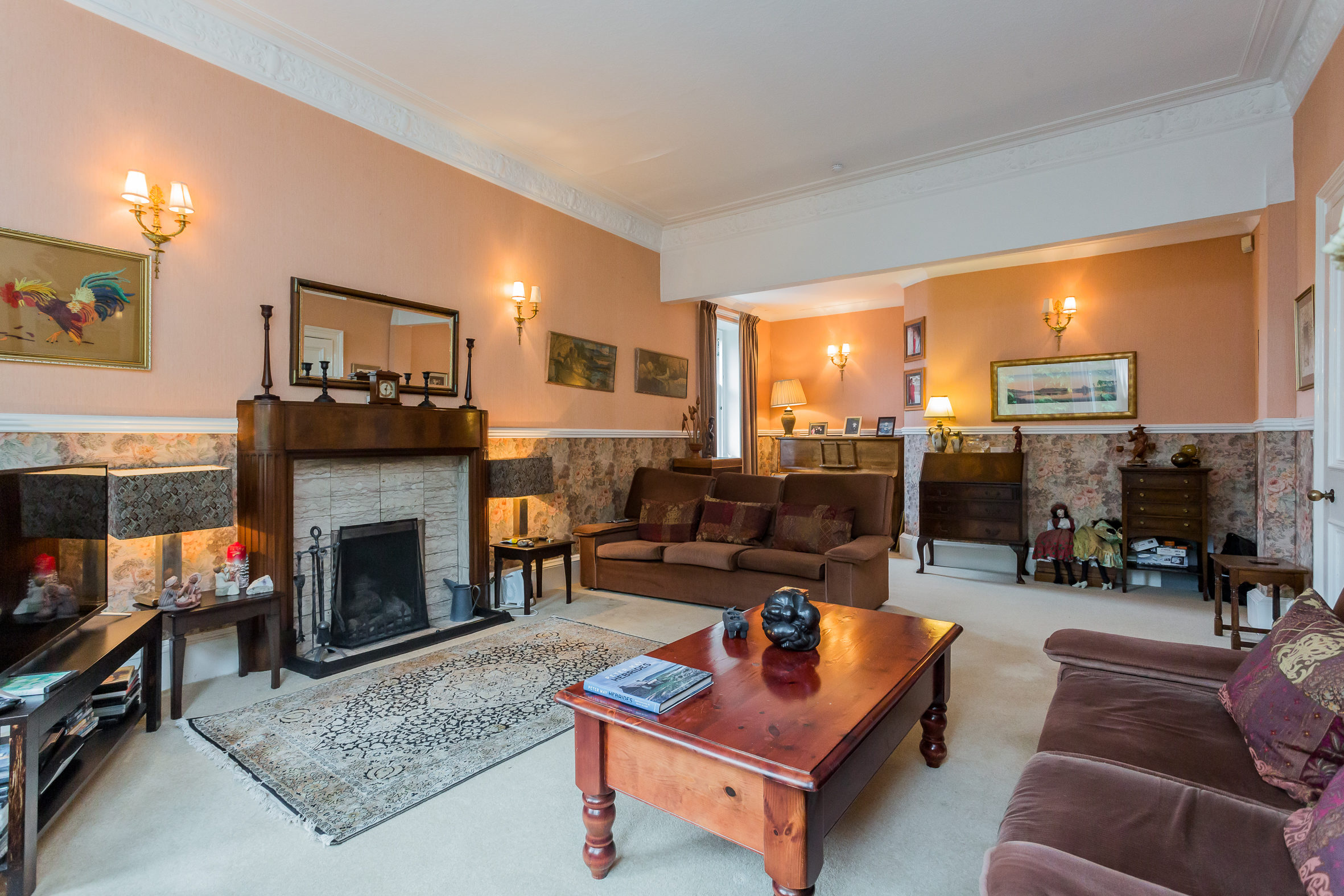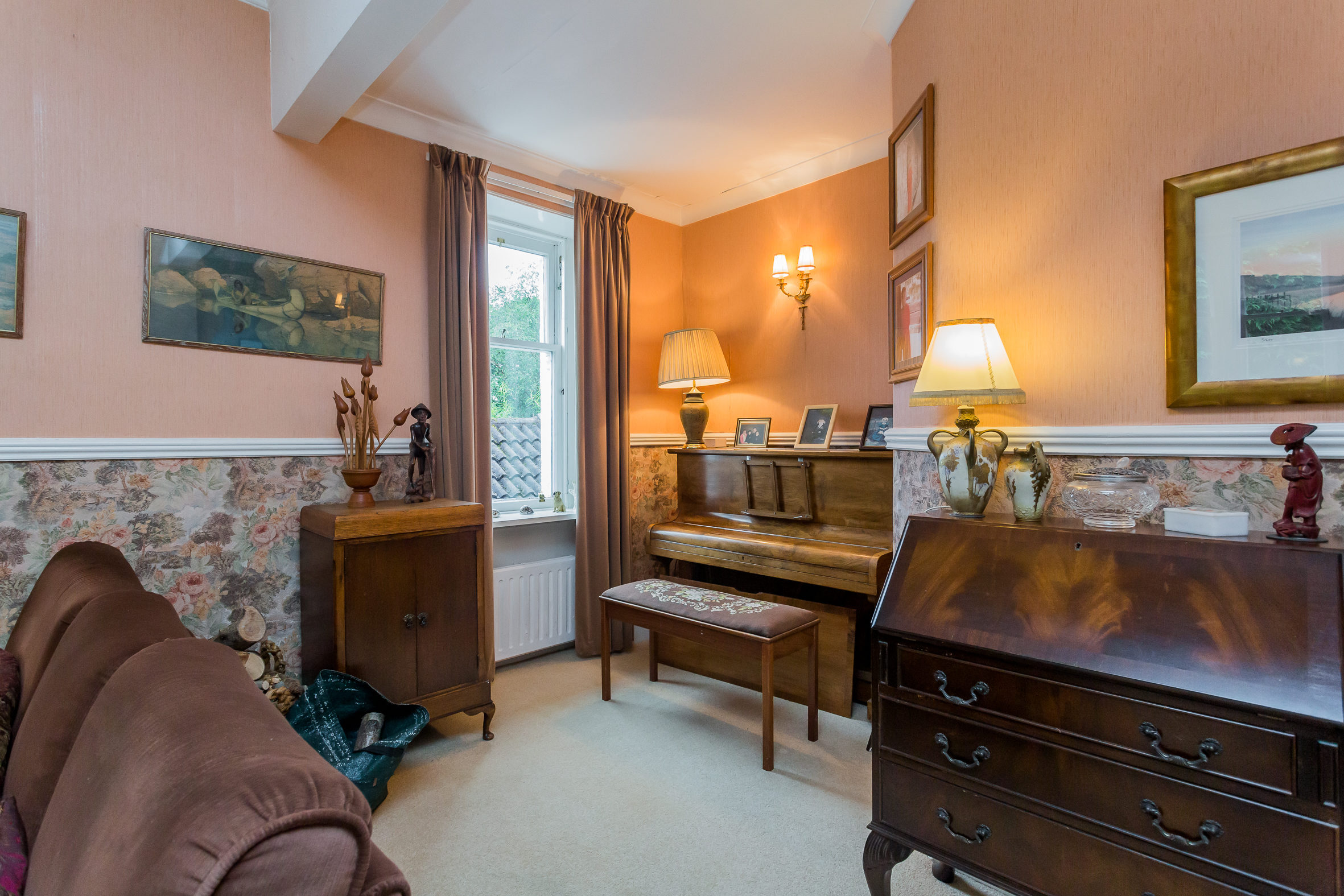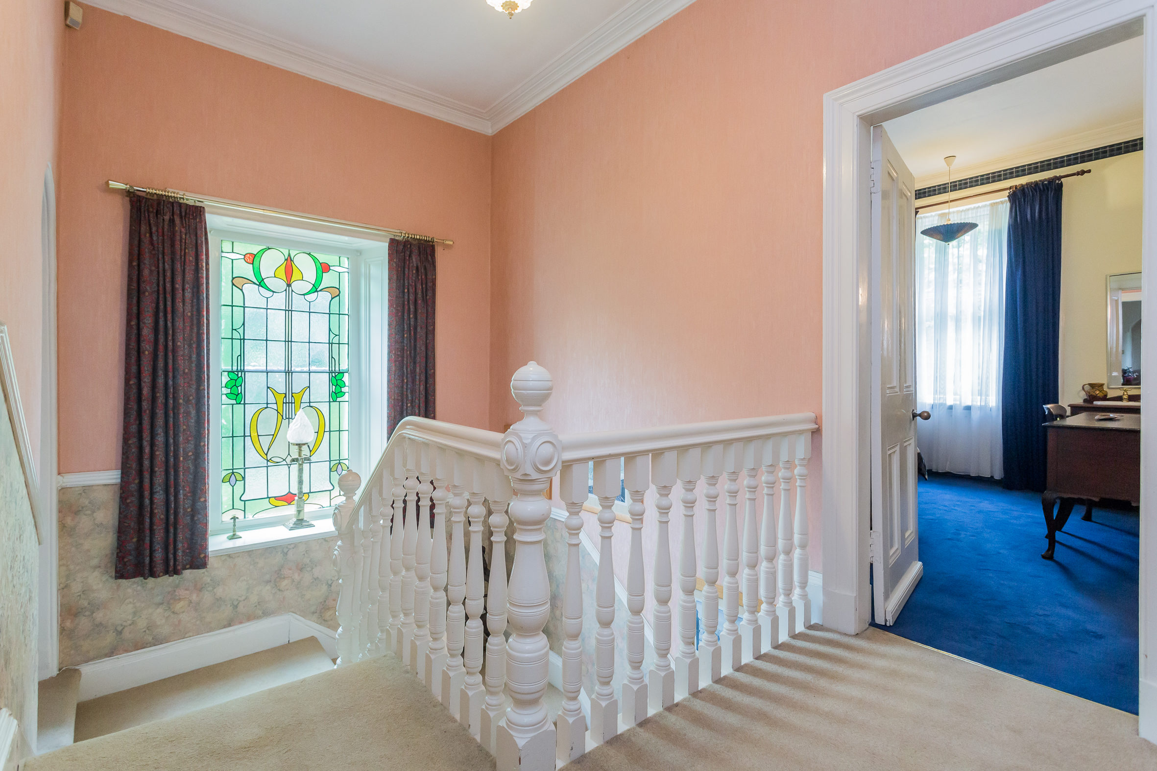 The house is entered via double leaf outer storm doors to the entrance vestibule and broad reception hallway that gives access to the bay window formal lounge with solid fuel fire. Also to the front is a sitting room. The dining room is to the rear and has a set of double doors that leads to the conservatory. A TV toom/snug is to the rear and gives access to the lower level kitchen that can also be accessed from the hallway. Completing the ground floor is a WC.