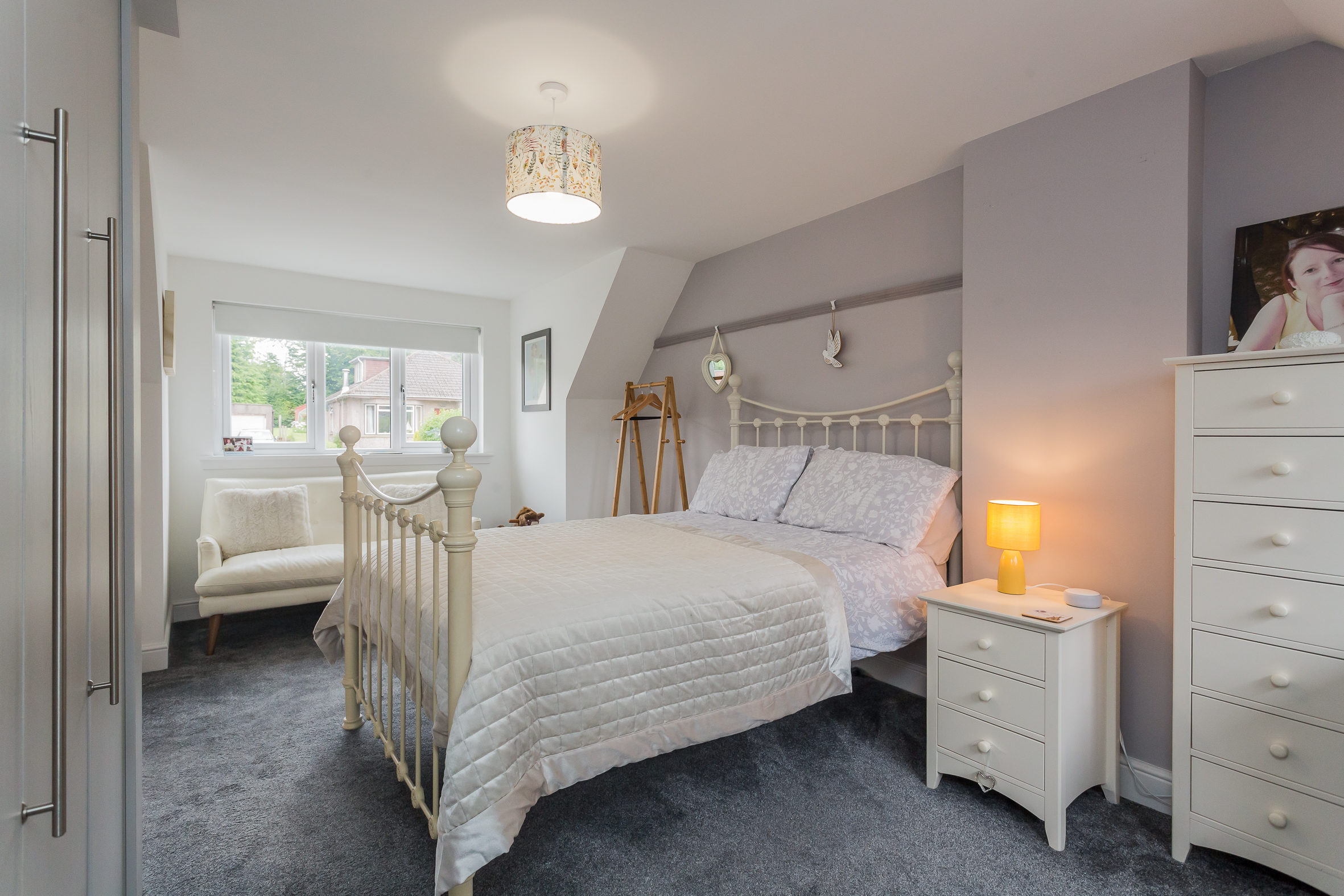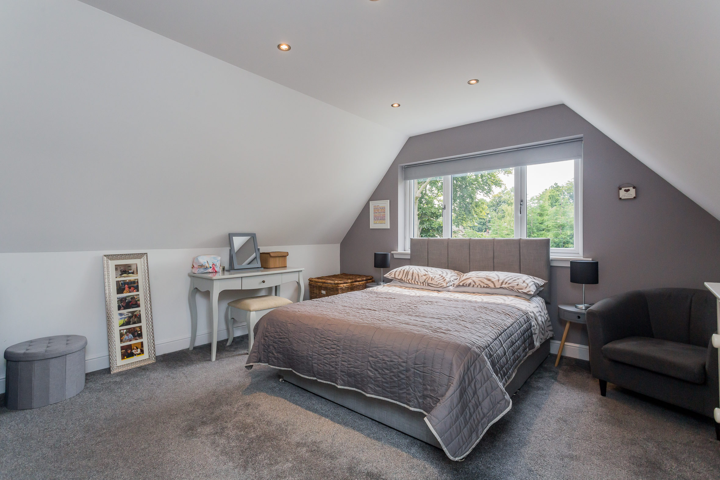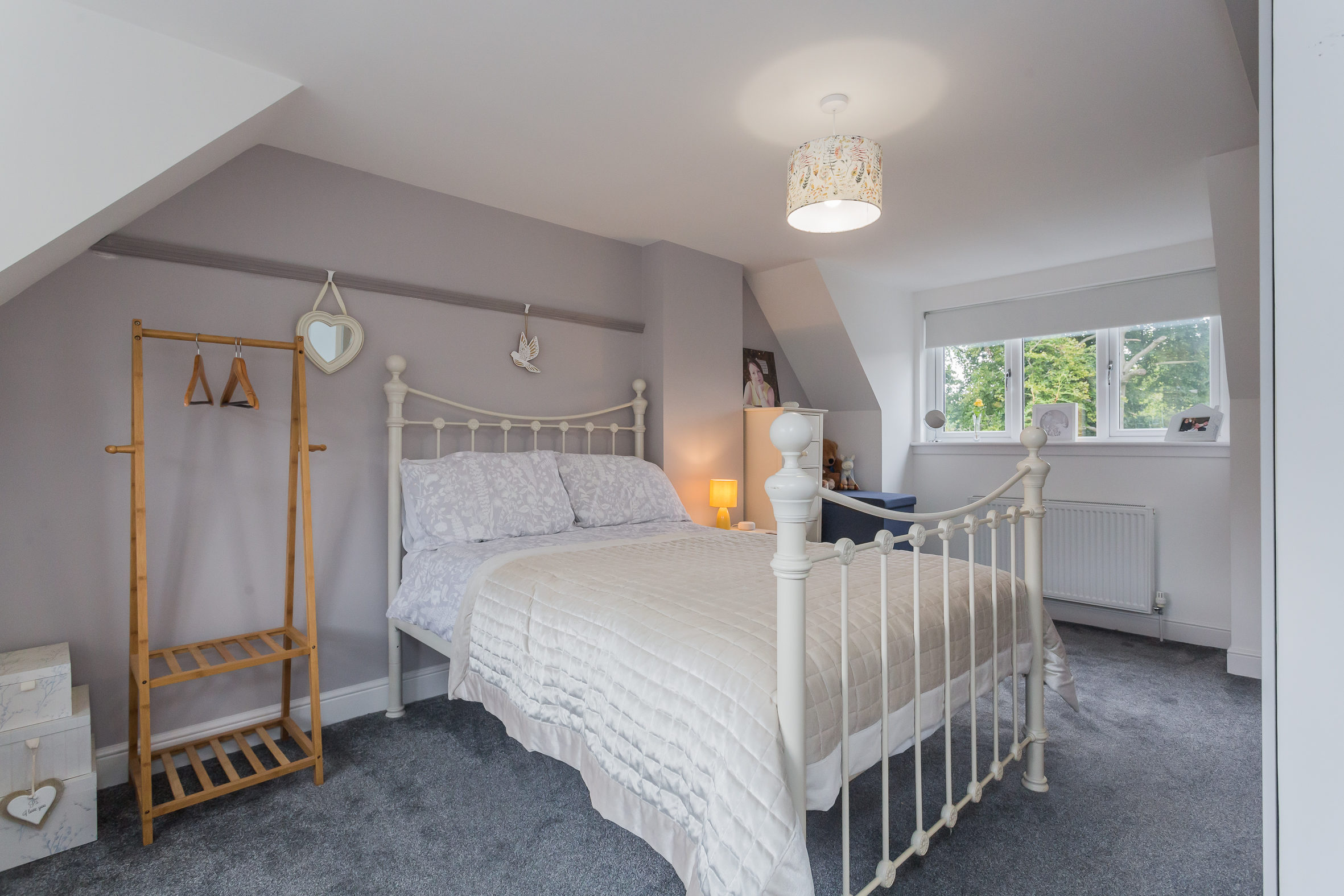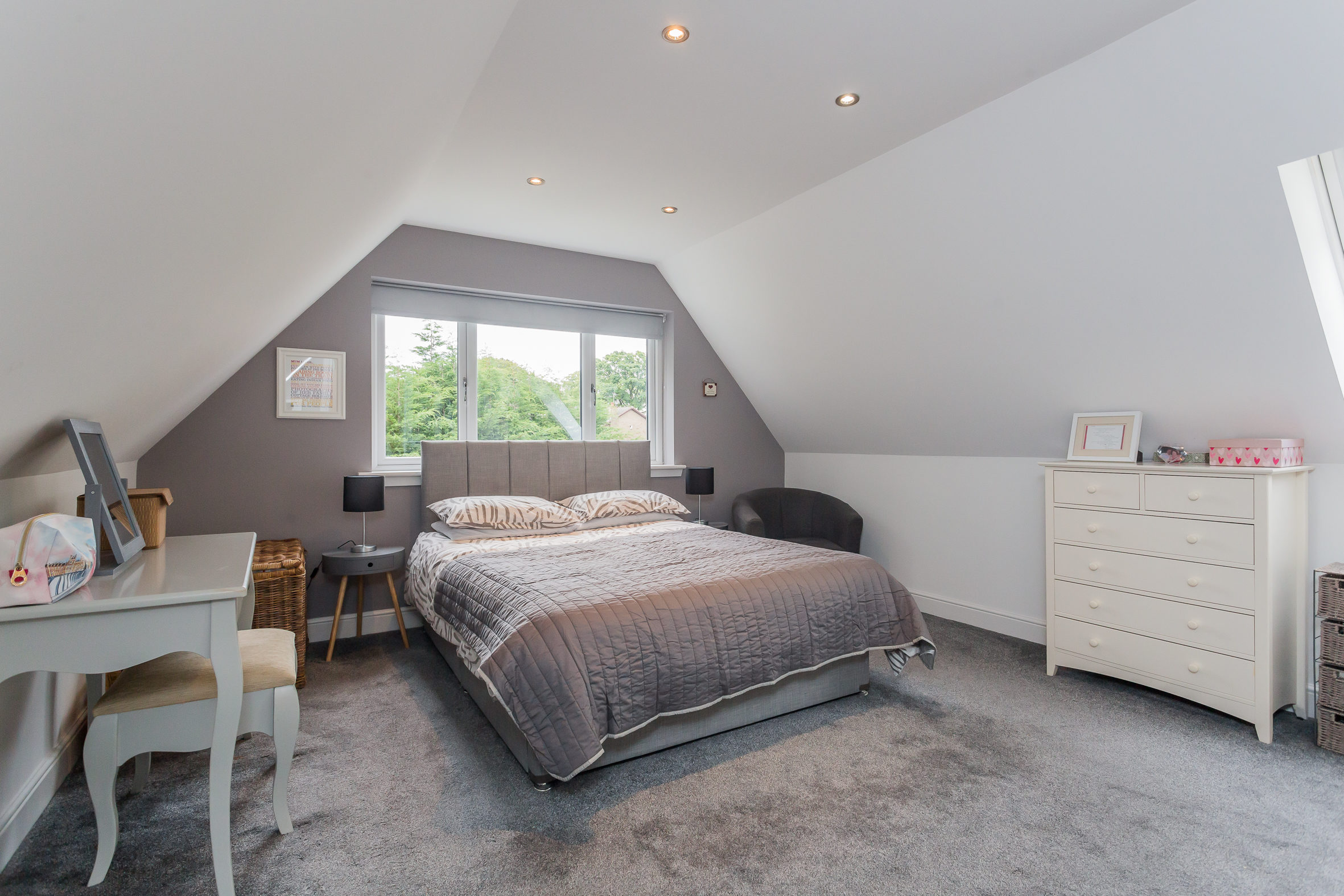 The carpeted stairwell splits into two at the top. Going straight ahead is the principal bedroom with vaulted ceiling and separate fully tiled shower room and to the front of the property two other bedrooms, both with built-in fitted wardrobes.