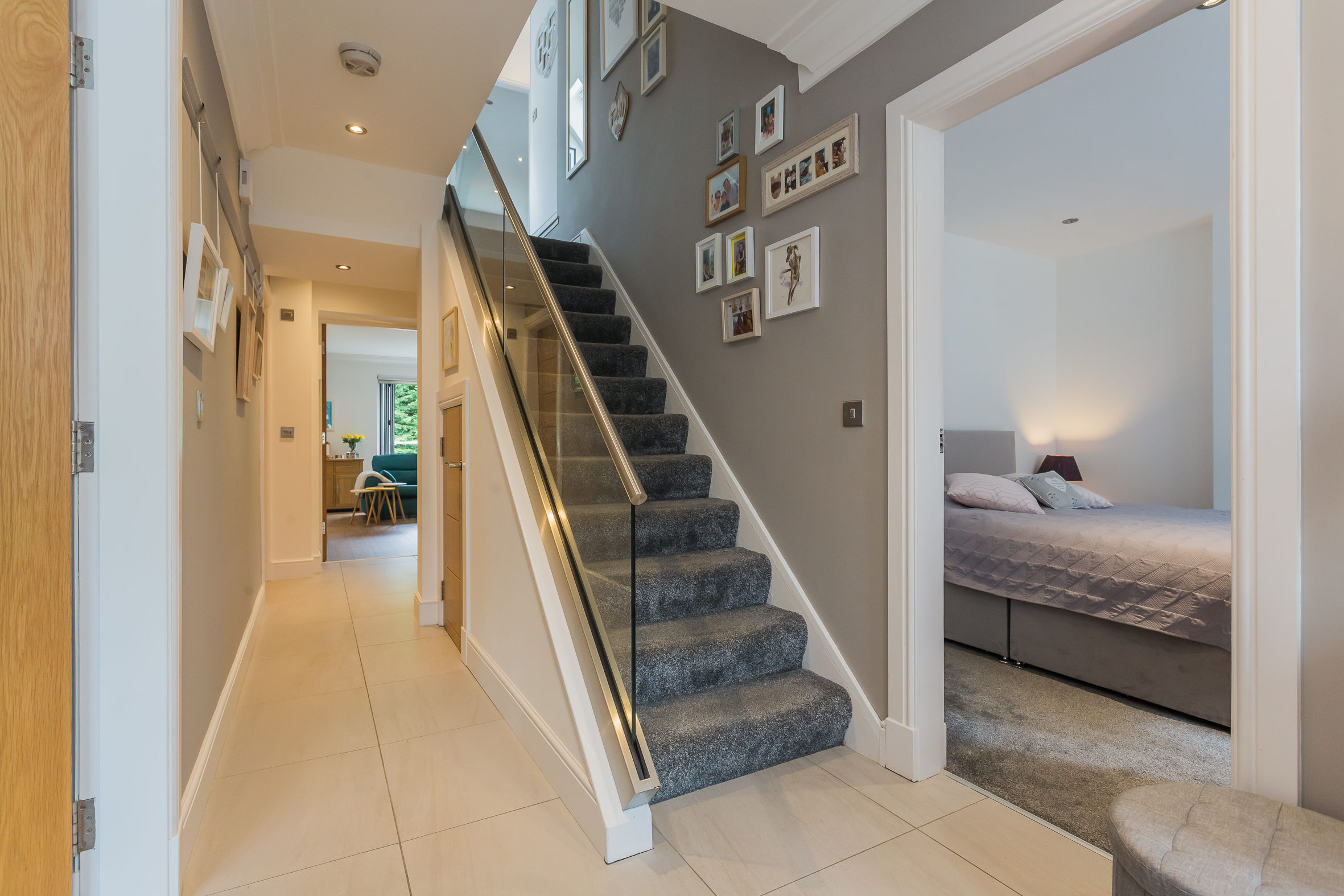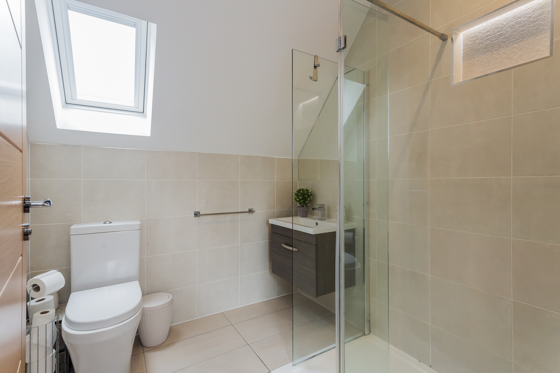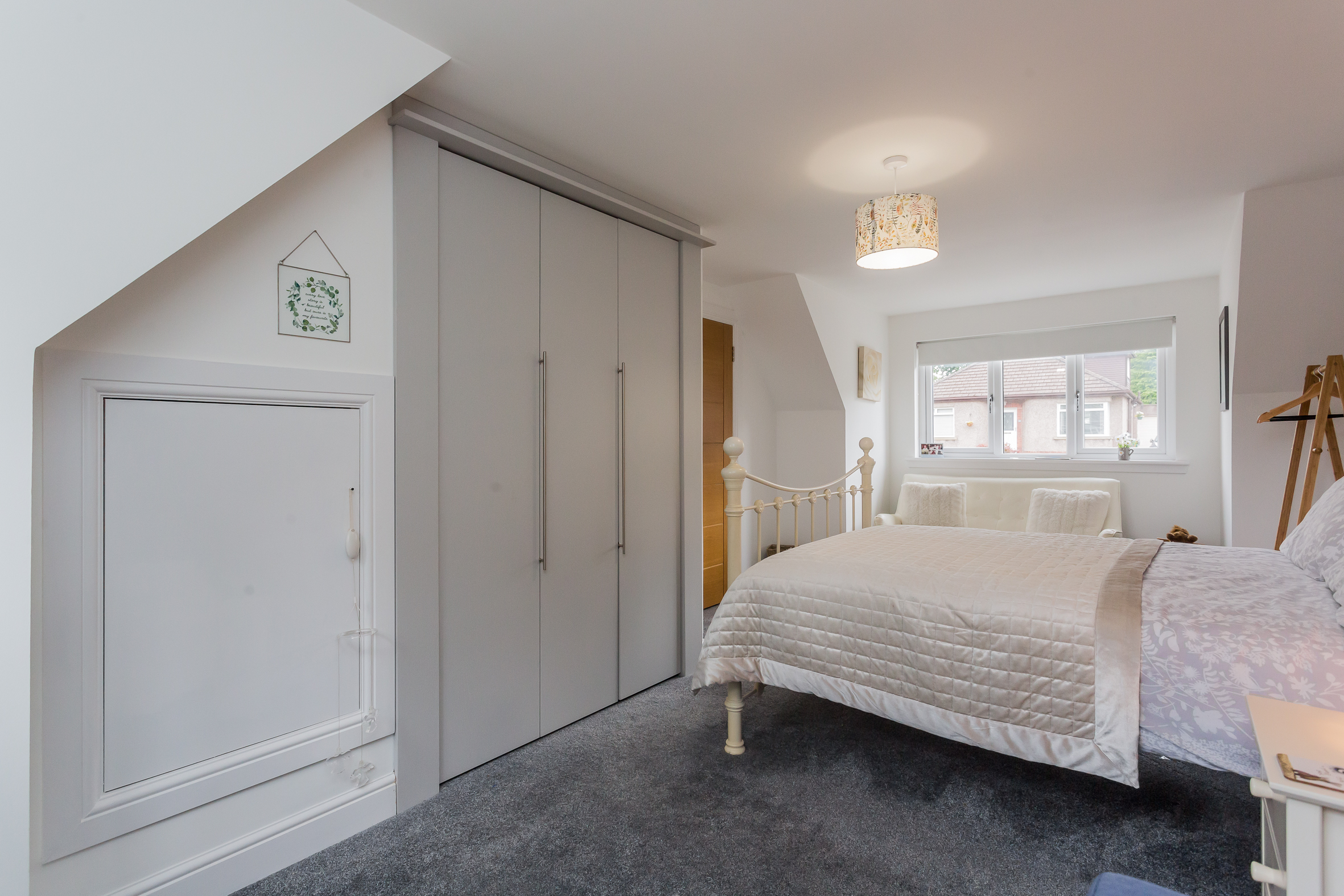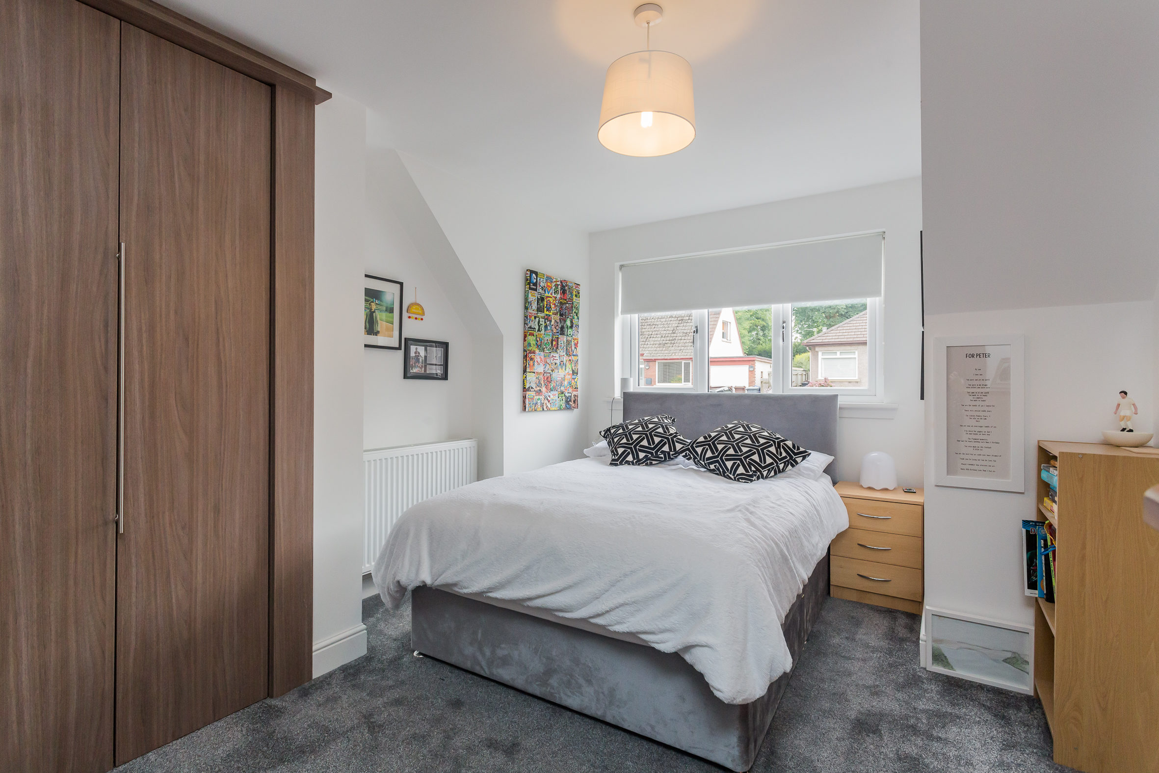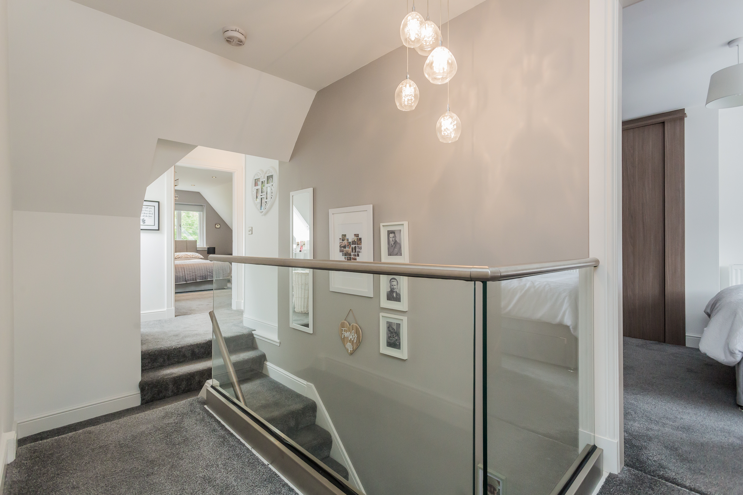 The carpeted stairwell splits into two at the top. Going straight ahead is the principal bedroom with vaulted ceiling and separate fully tiled shower room and to the front of the property two other bedrooms, both with built-in fitted wardrobes.