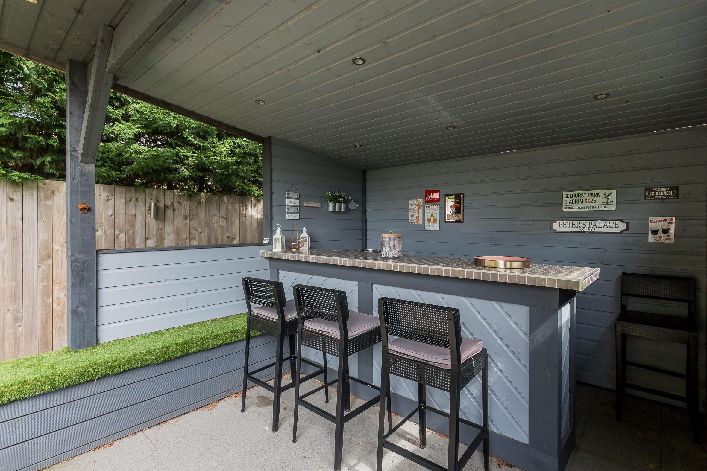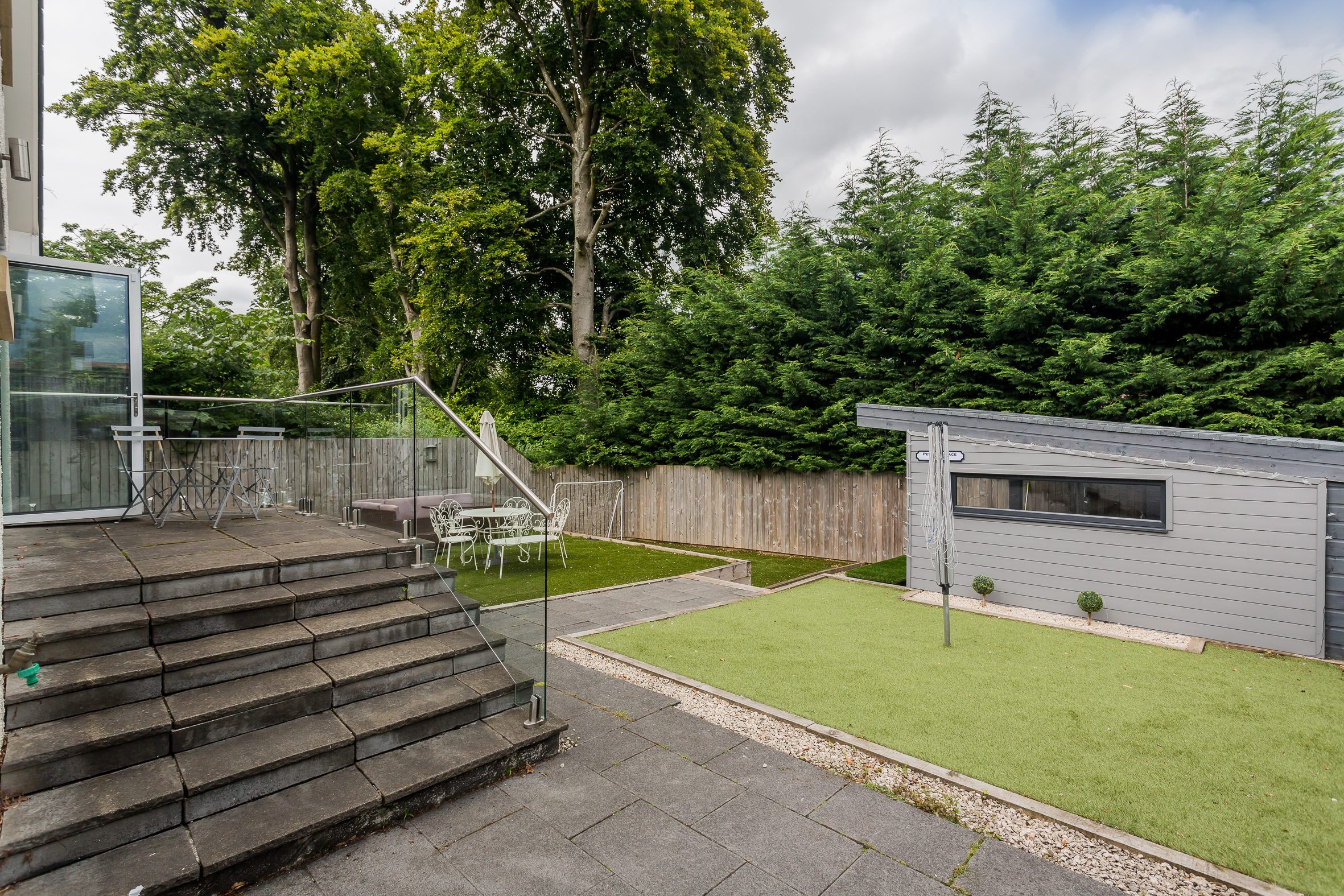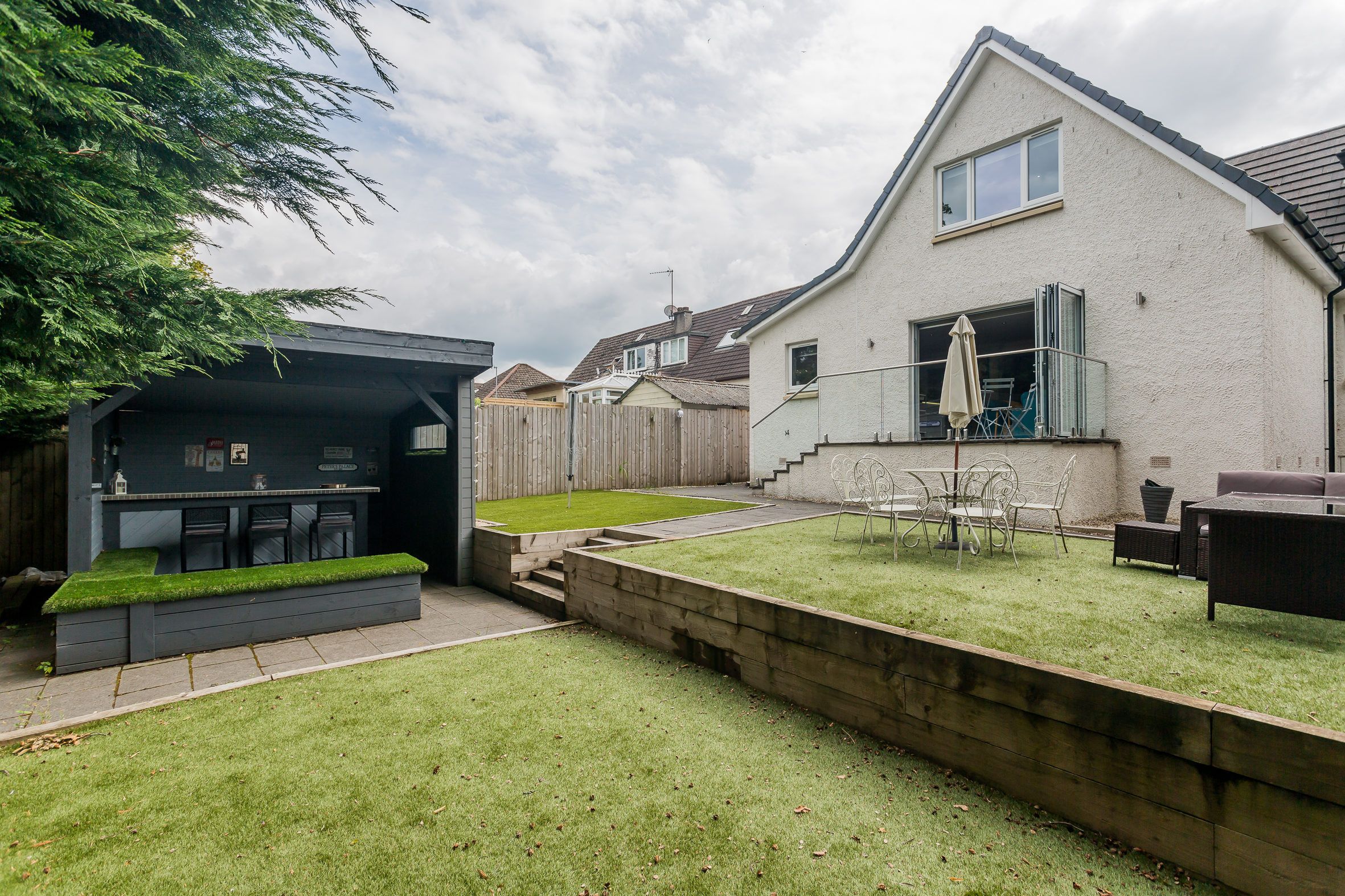 Externally to the front there is substantial parking bordered by a stone dashed wall surrounding. The fabulous, landscaped rear gardens are easily maintained with a blend of Astro grass, planters and patio areas with the lower level having a fantastic, covered bar area. The garden is private with mature trees and timber fencing surrounding.