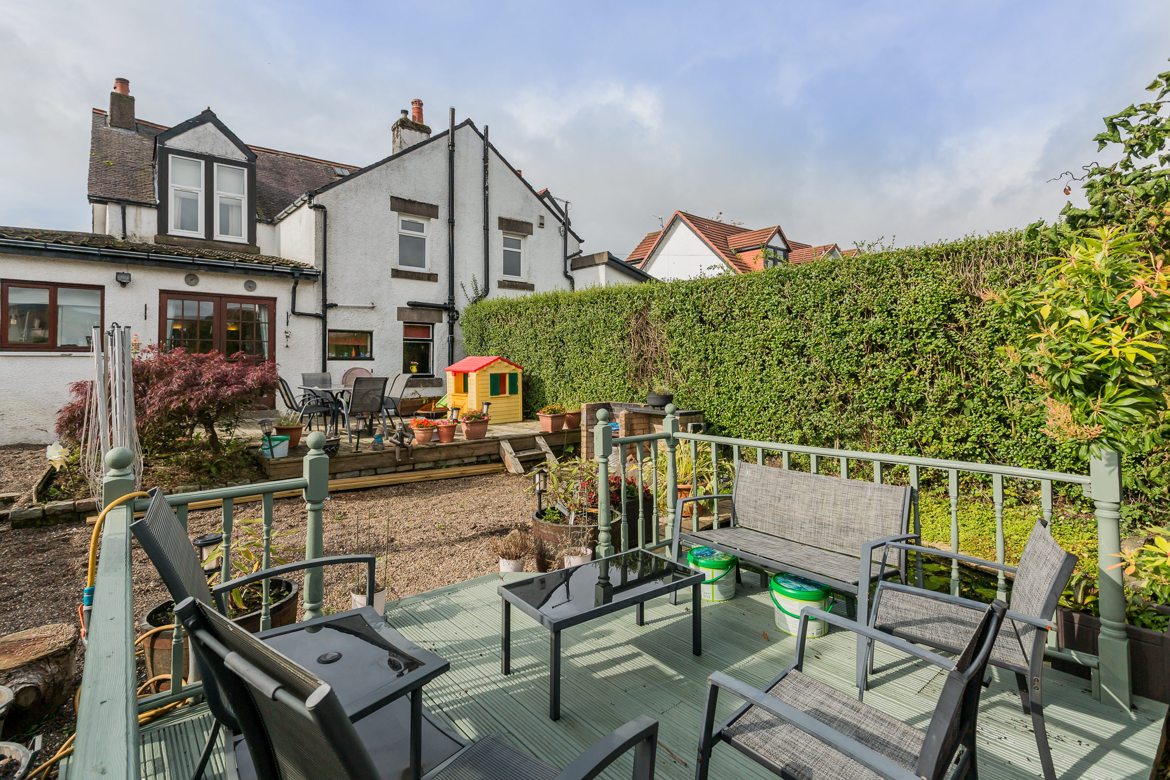 The fantastically proportioned rear garden is enclosed with timber fencing and gate access for off street parking. There are two separate patio areas, greenhouse and an ornamental pond. To the front is a lawn with plant beds bordering.