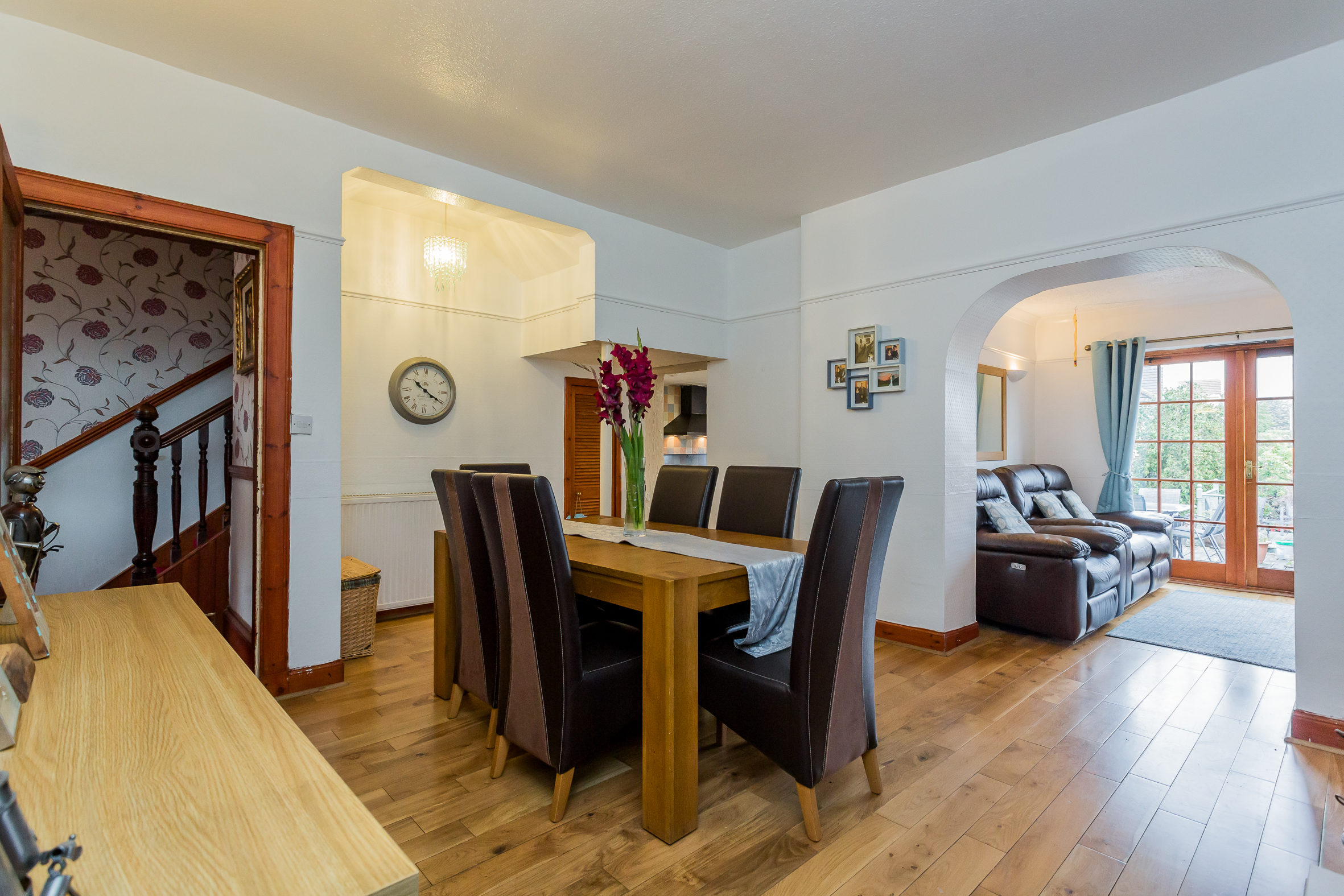 An entrance vestibule leads into the reception hallway. To the front is the formal lounge with fireplace, solid fuel fire and a beautiful laid parquet floor. The hallway continues through to the dining room which is open plan with both the kitchen and a sitting room that has French doors leading directly to the garden. In addition, there is a utility area with plumbing and again a door to the garden as well as a shower room and a ground floor bedroom.