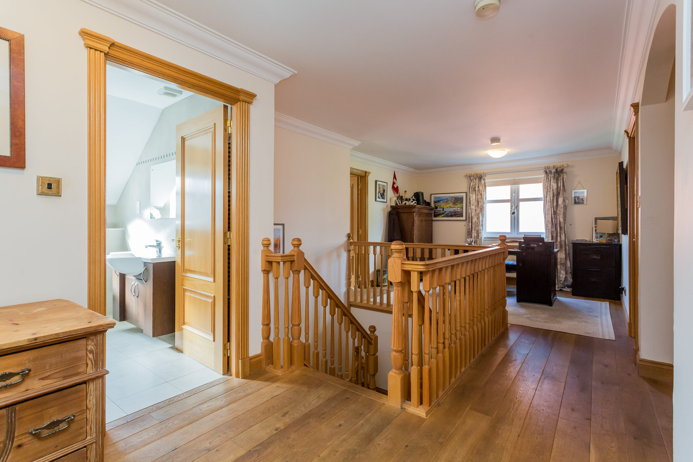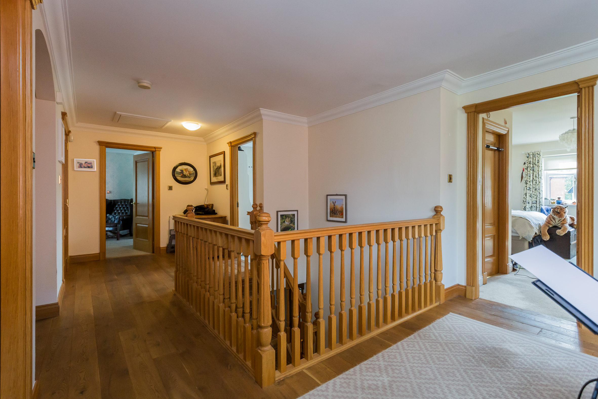 The feature stairwell leads to the first floor landing and the bedroom accommodation. The upper landing is an ideal office or study space due to its proportions. The principal bedroom has a walk-in dressing area and en-suite shower room, as does two other bedrooms. A further bedroom and the house bathroom complete the accommodation.