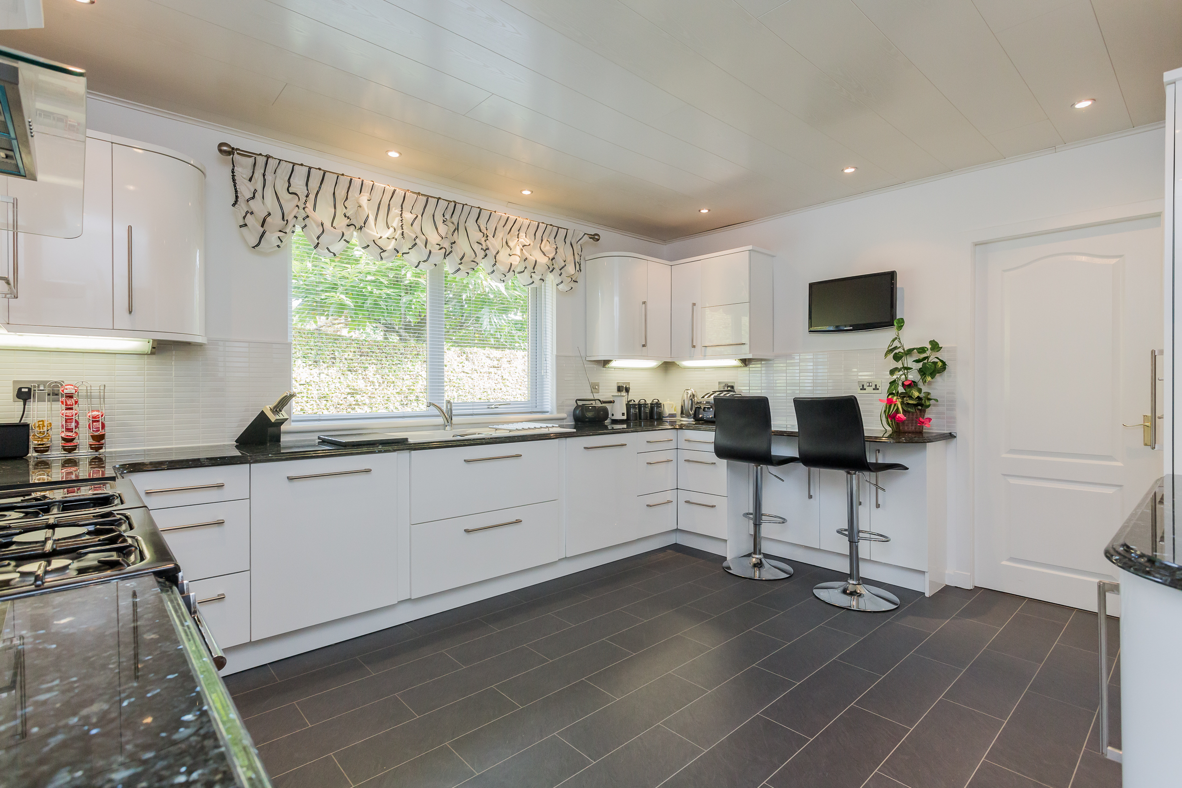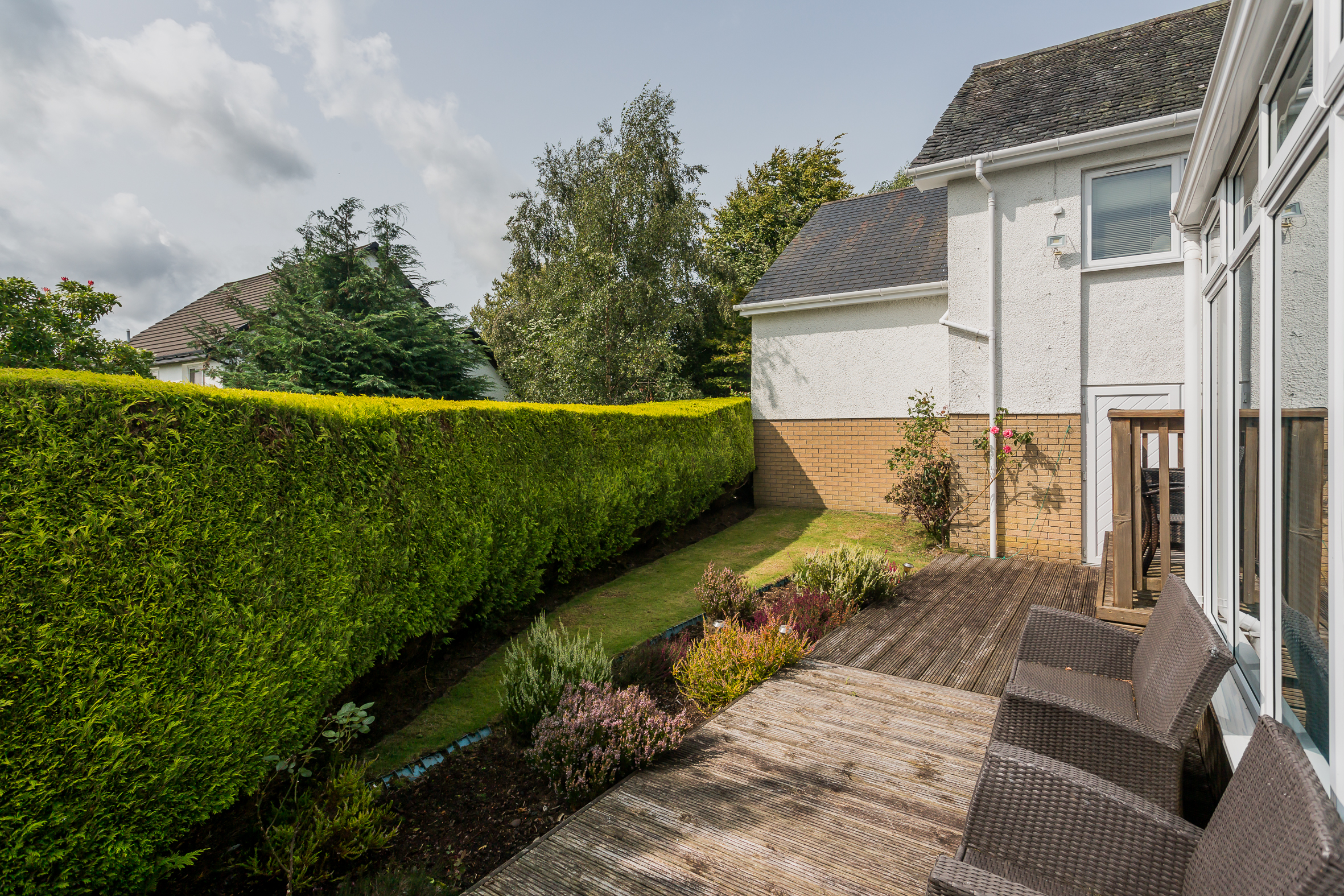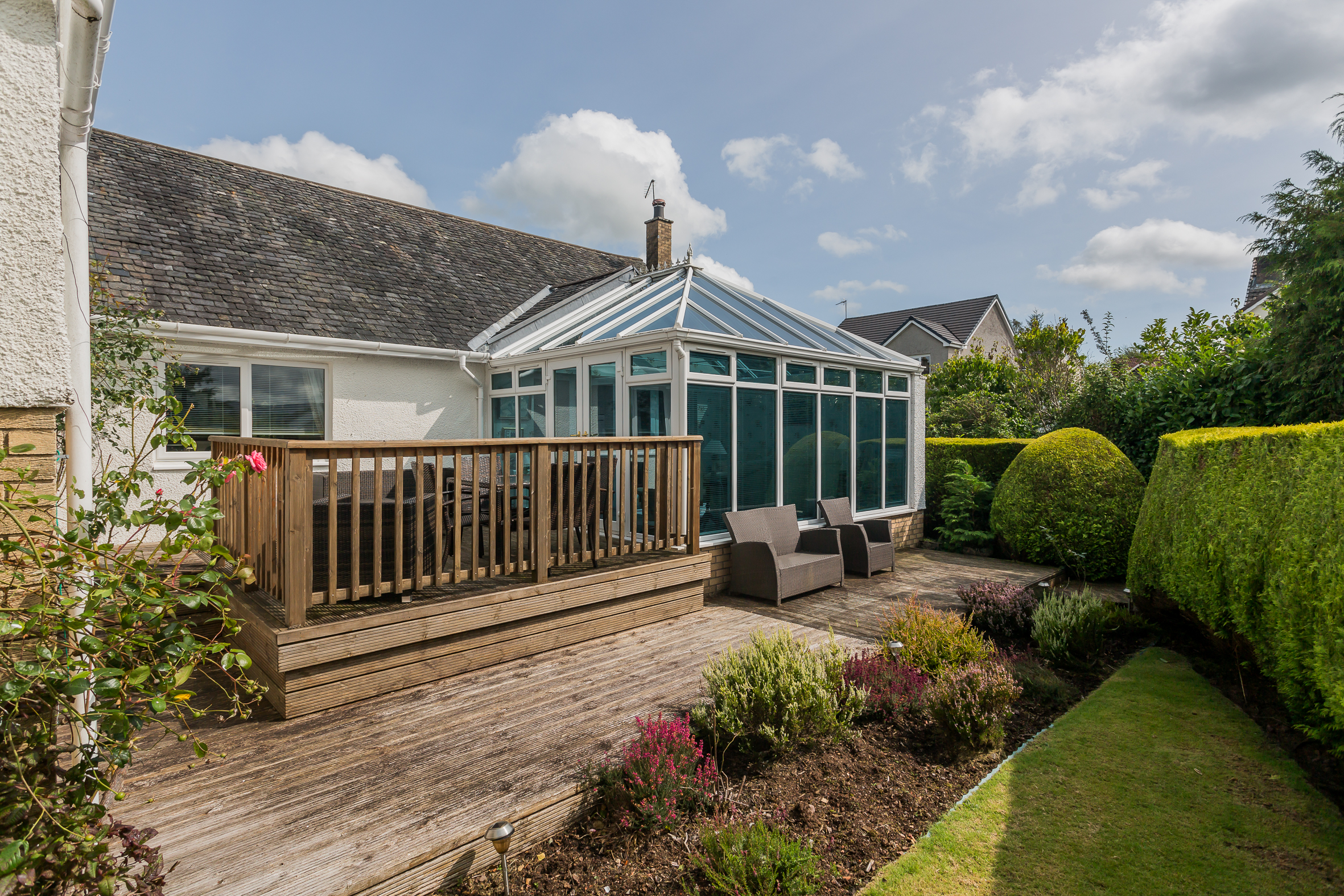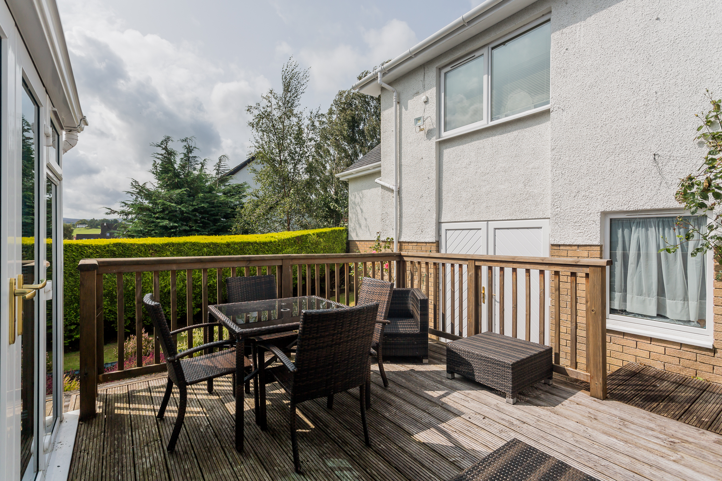 The kitchen has modern units with integrated oven, hob, extractor hood, fridge freezer and dishwasher. A Rangemaster range completes the cooking facilities and for casual dining there is a granite breakfast bar complementing the white units. The utility room has matching units and a Upvc door to the side. The conservatory is off the lounge and has French doors leading to a very private deck area. Timber decking then leads to the basement (ideal for storage or could be a gym) and onto to a raised seating area. Furthermore it meanders through the gardens like a rope bridge and appears to both front and back of the house.