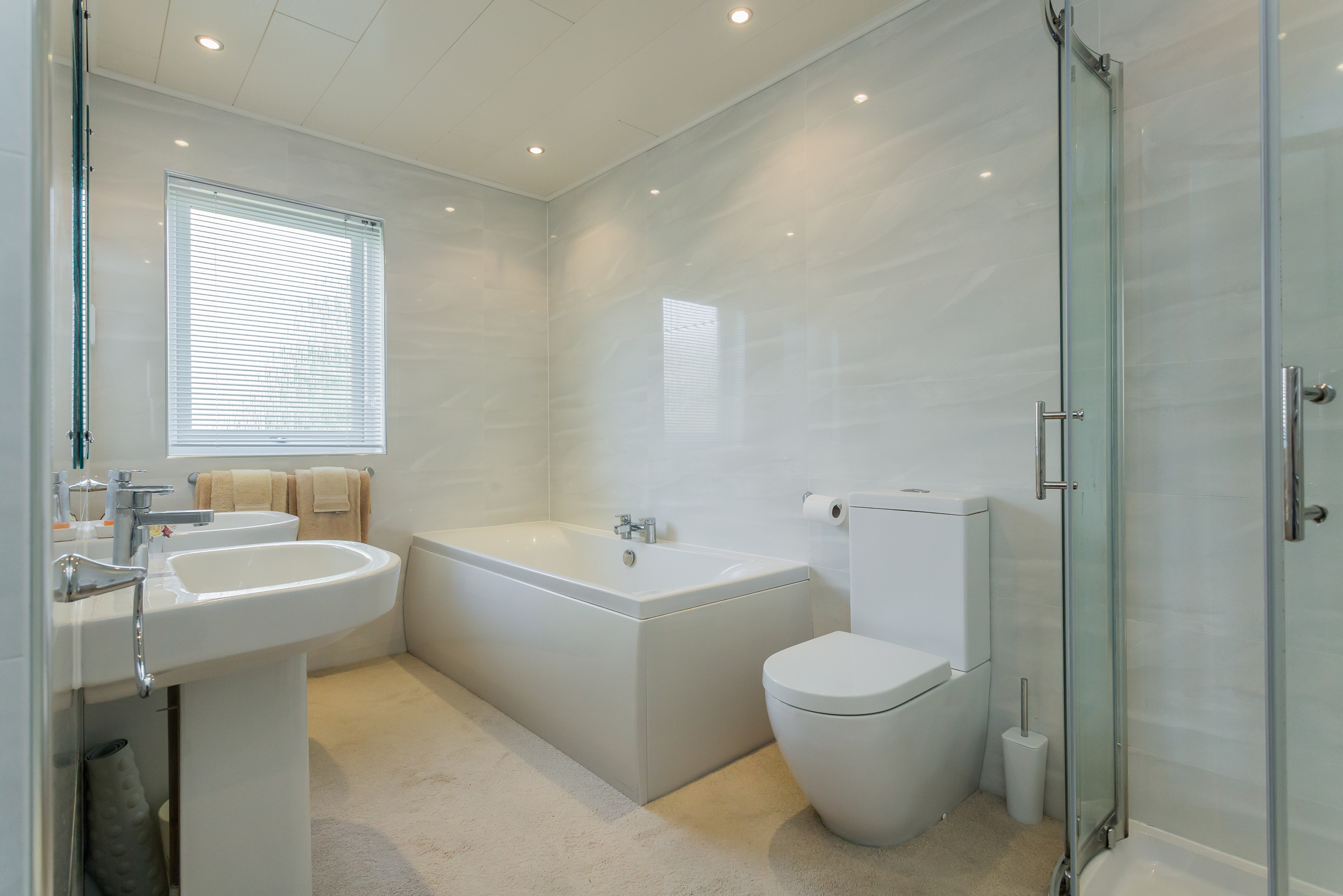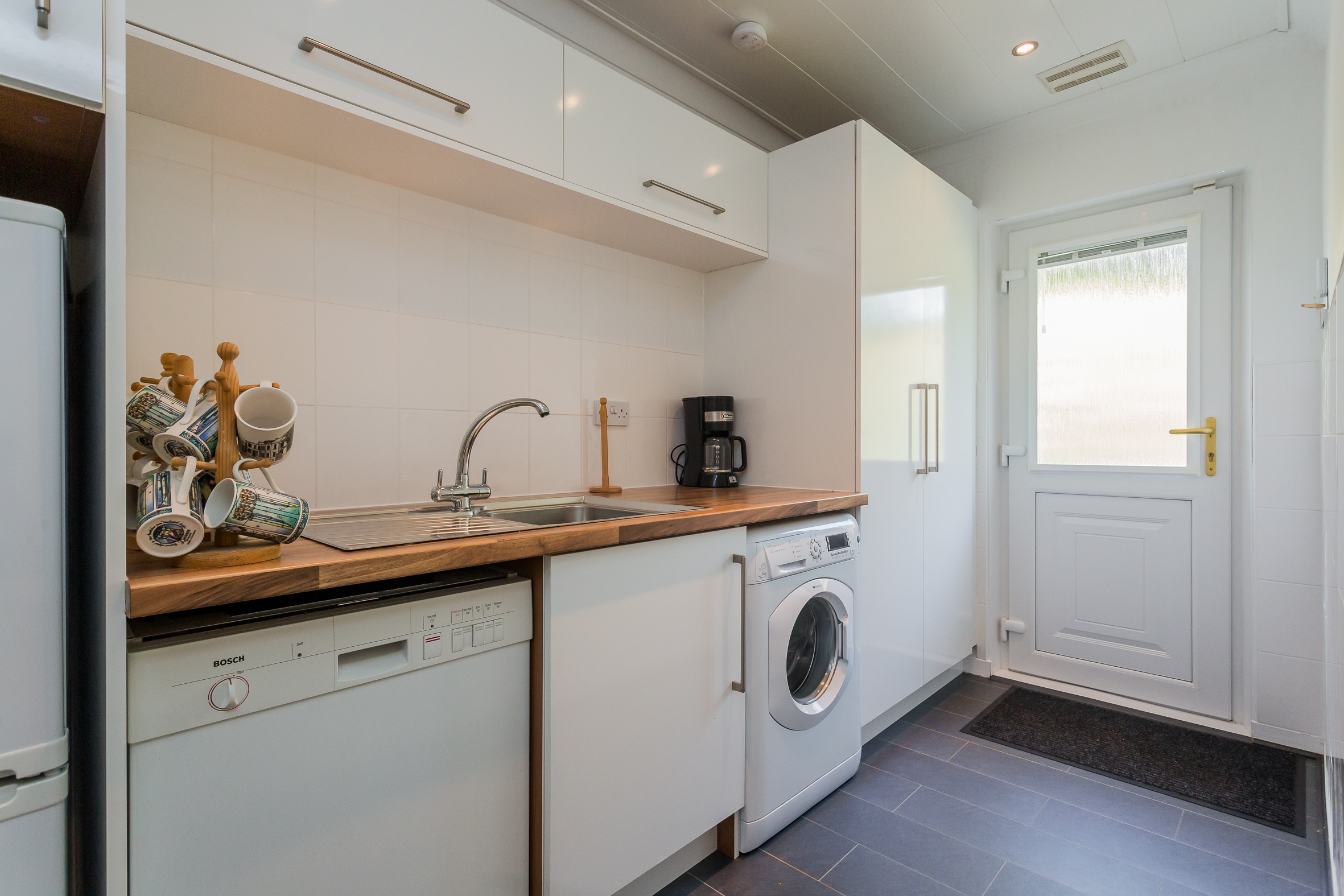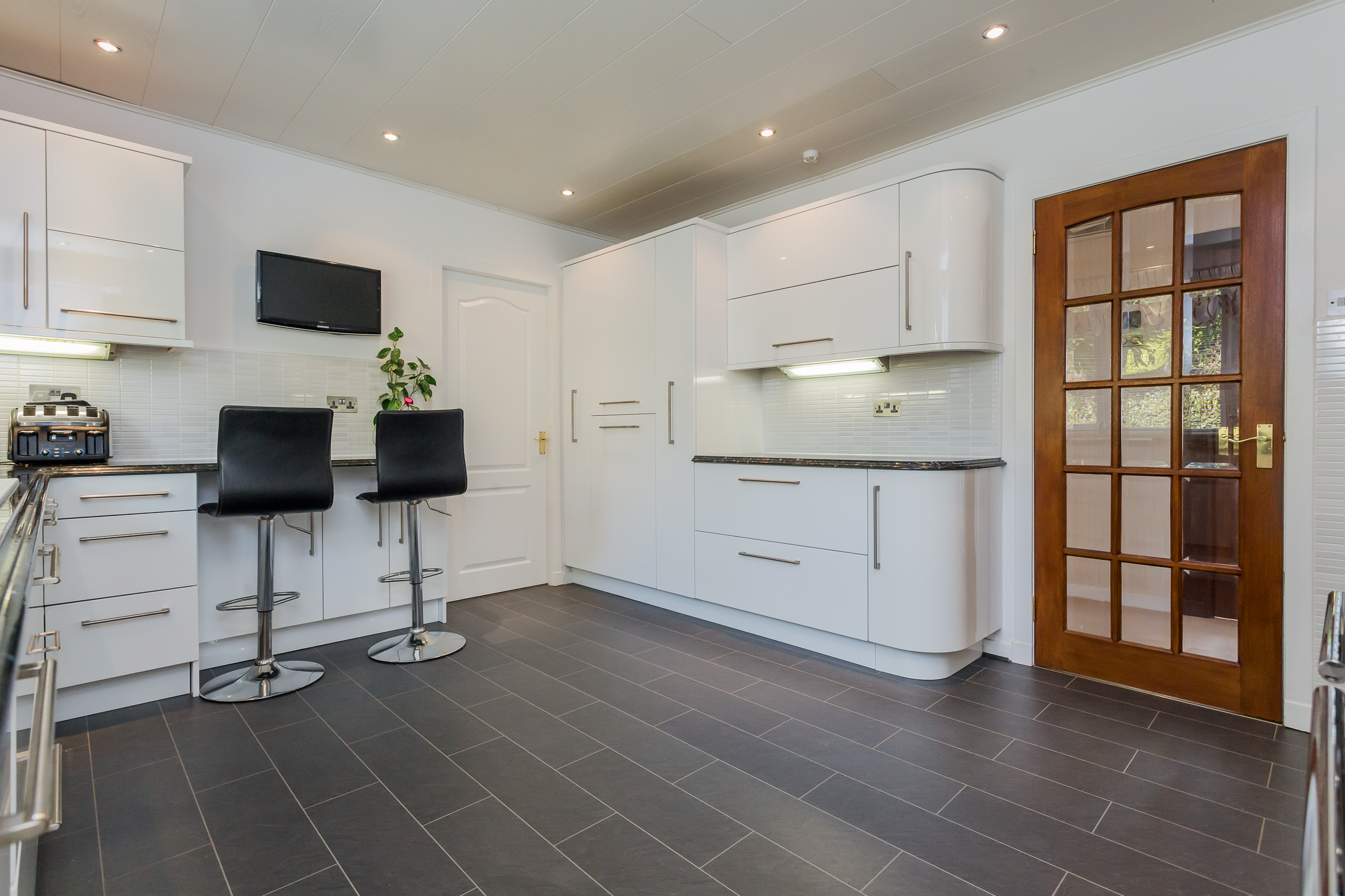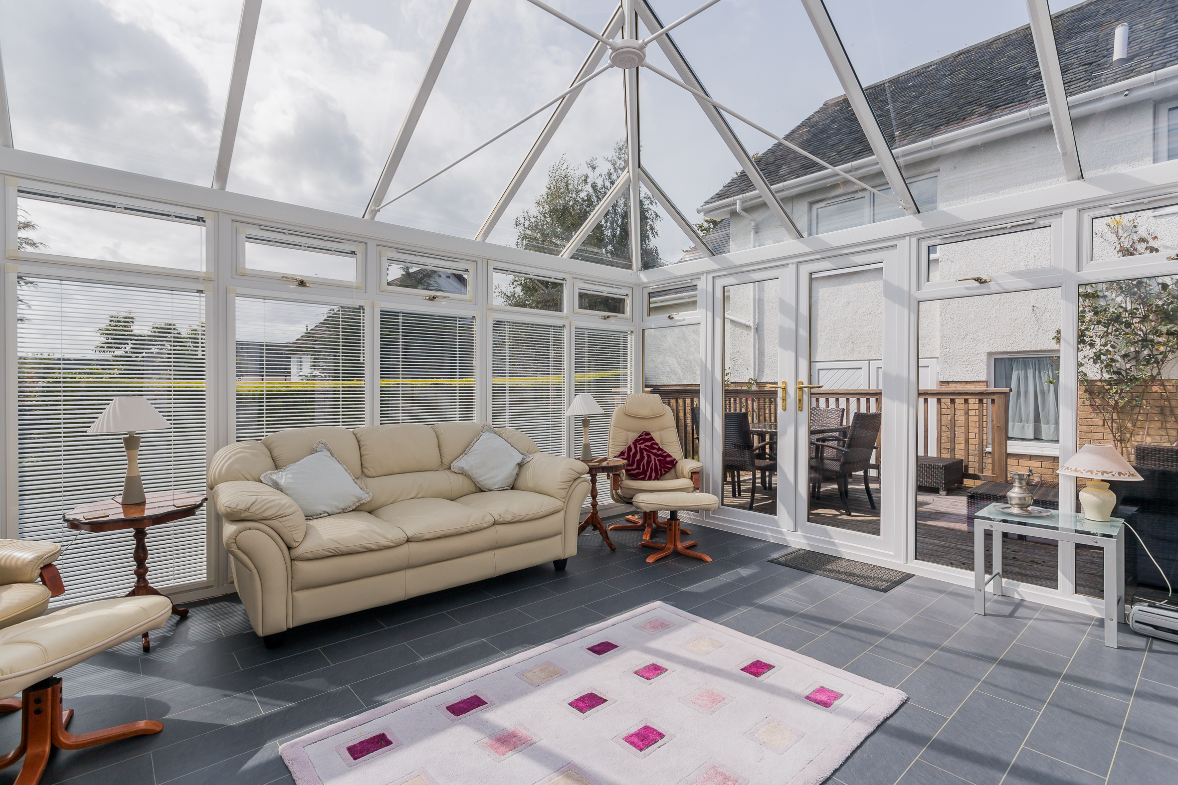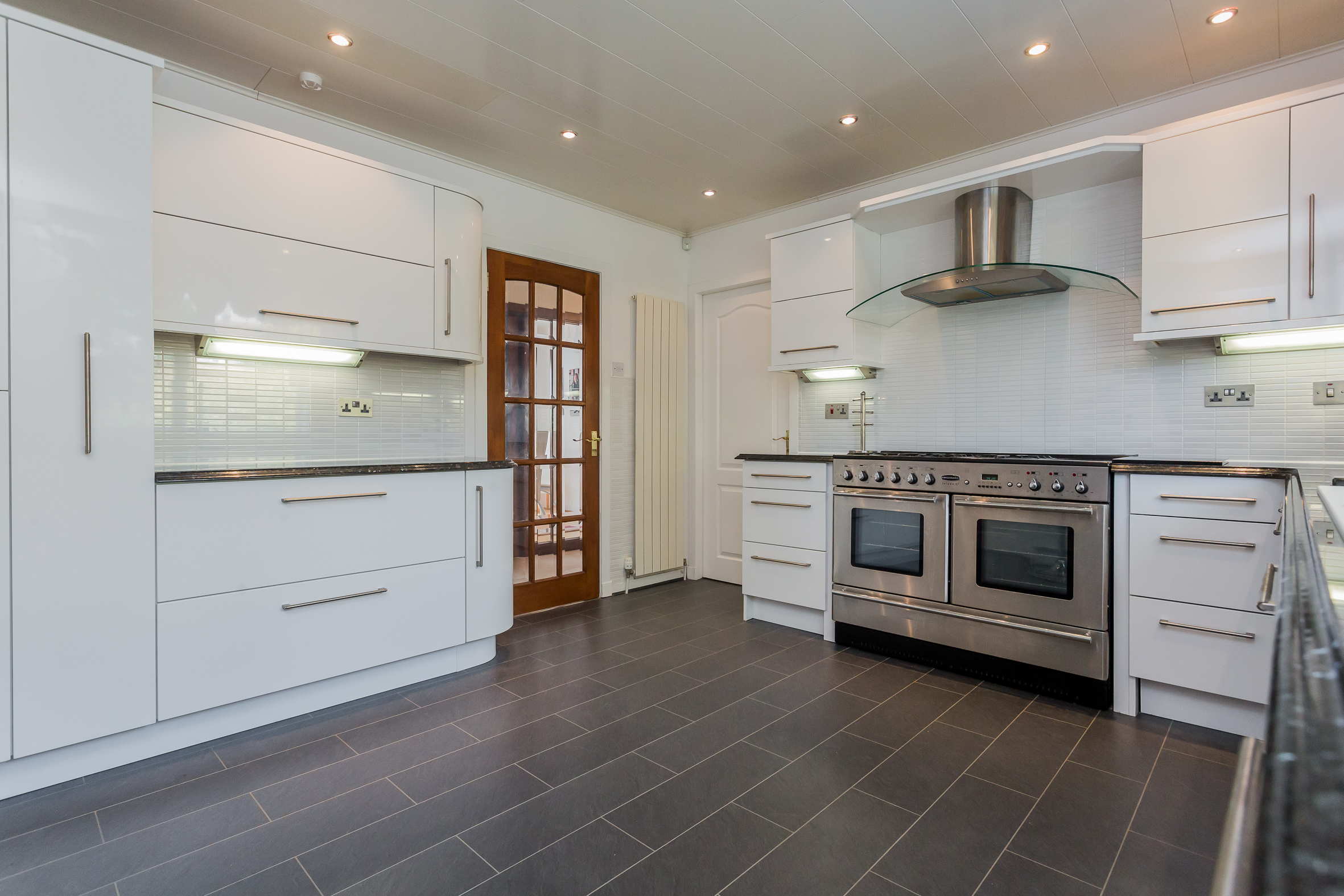 The kitchen has modern units with integrated oven, hob, extractor hood, fridge freezer and dishwasher. A Rangemaster range completes the cooking facilities and for casual dining there is a granite breakfast bar complementing the white units. The utility room has matching units and a Upvc door to the side. The conservatory is off the lounge and has French doors leading to a very private deck area. Timber decking then leads to the basement (ideal for storage or could be a gym) and onto to a raised seating area. Furthermore it meanders through the gardens like a rope bridge and appears to both front and back of the house.