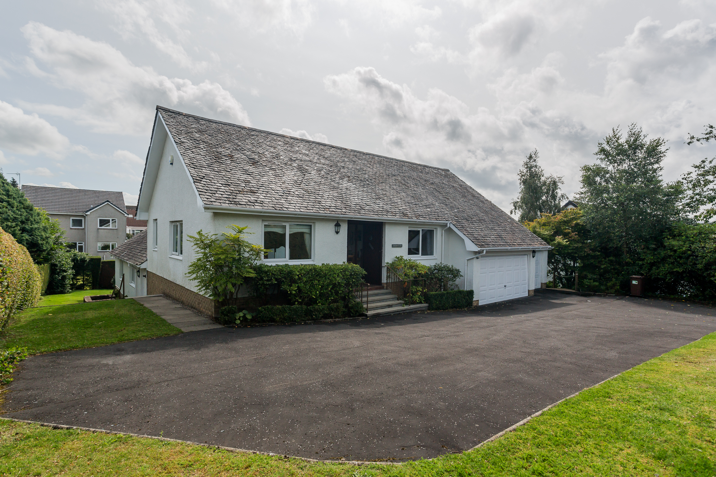 'Thorncliff' is a handsome detached home with slate roof and brilliant white harling set amidst beautiful mature gardens within walking distance of schooling and Kilmacolm village centre. Individually built in the 1980’s and since upgraded and modernised, the property offers flexible accommodation over a split level of significant proportions.