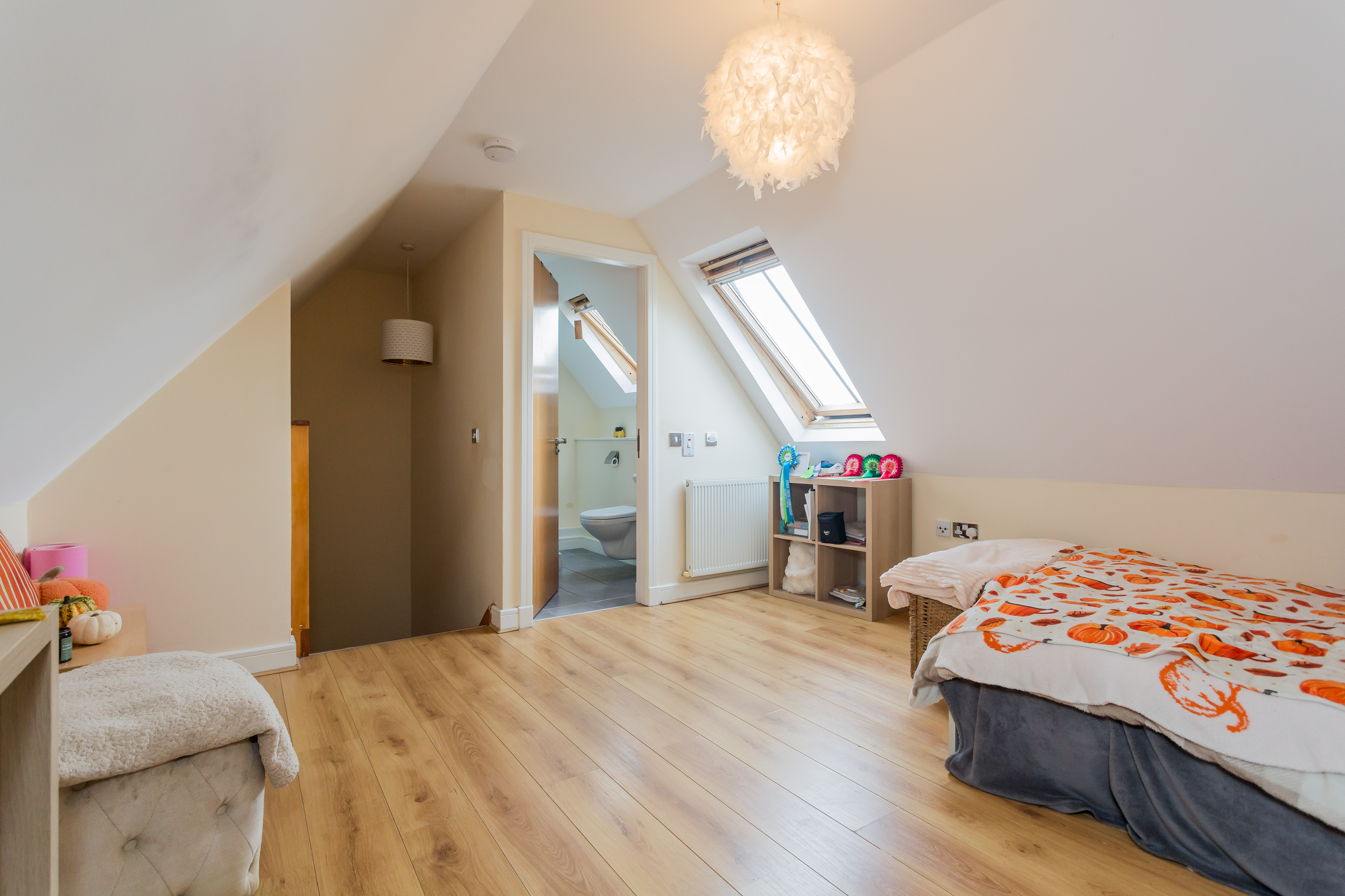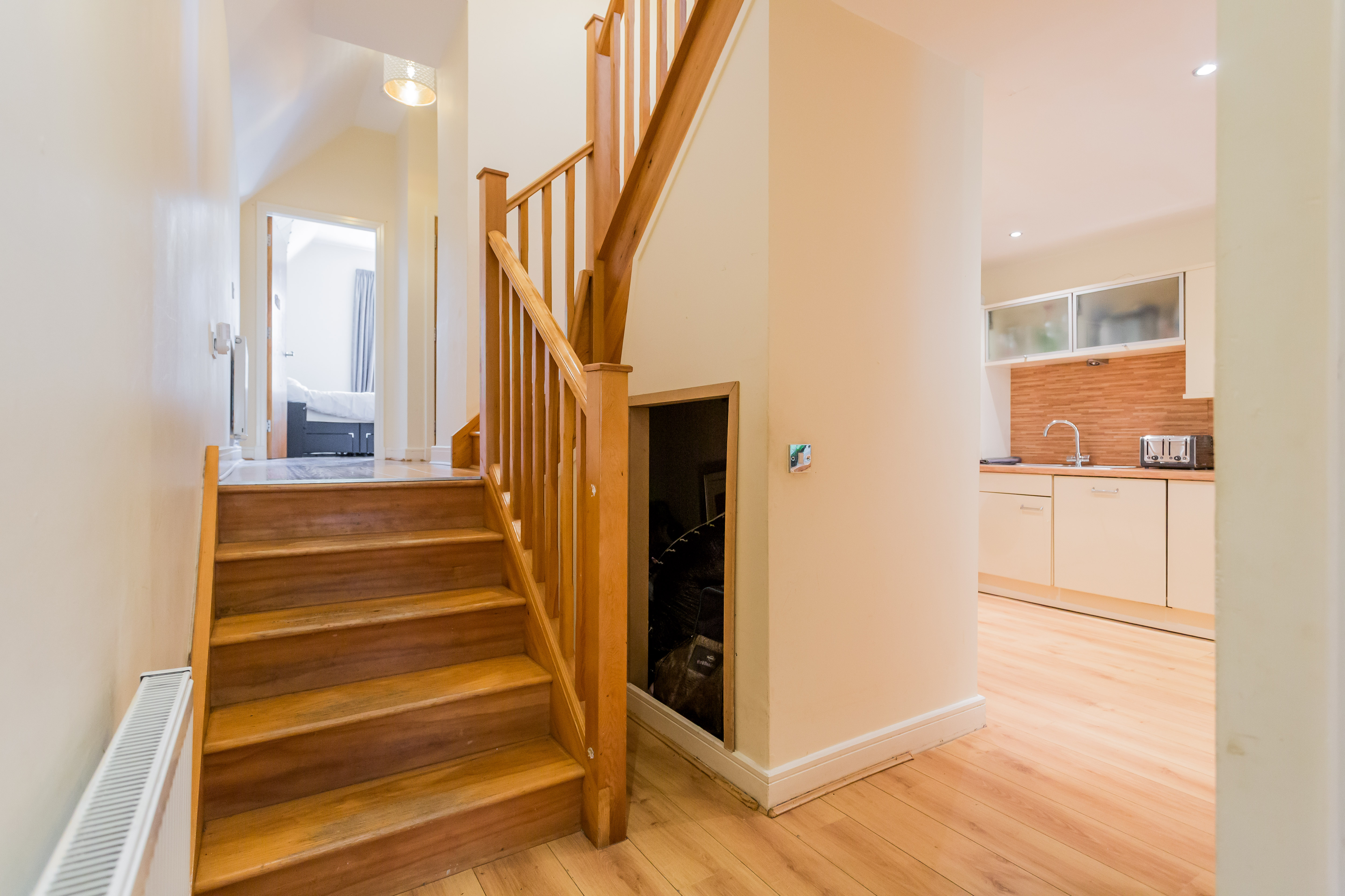 A wooden stairwell leads to the upper hallway where there is a further storage cupboard, the fully tiled house bathroom and bedroom two. A second wooden stairwell leads to the principal bedroom which has two built in fitted wardrobes and an en-suite shower room.
