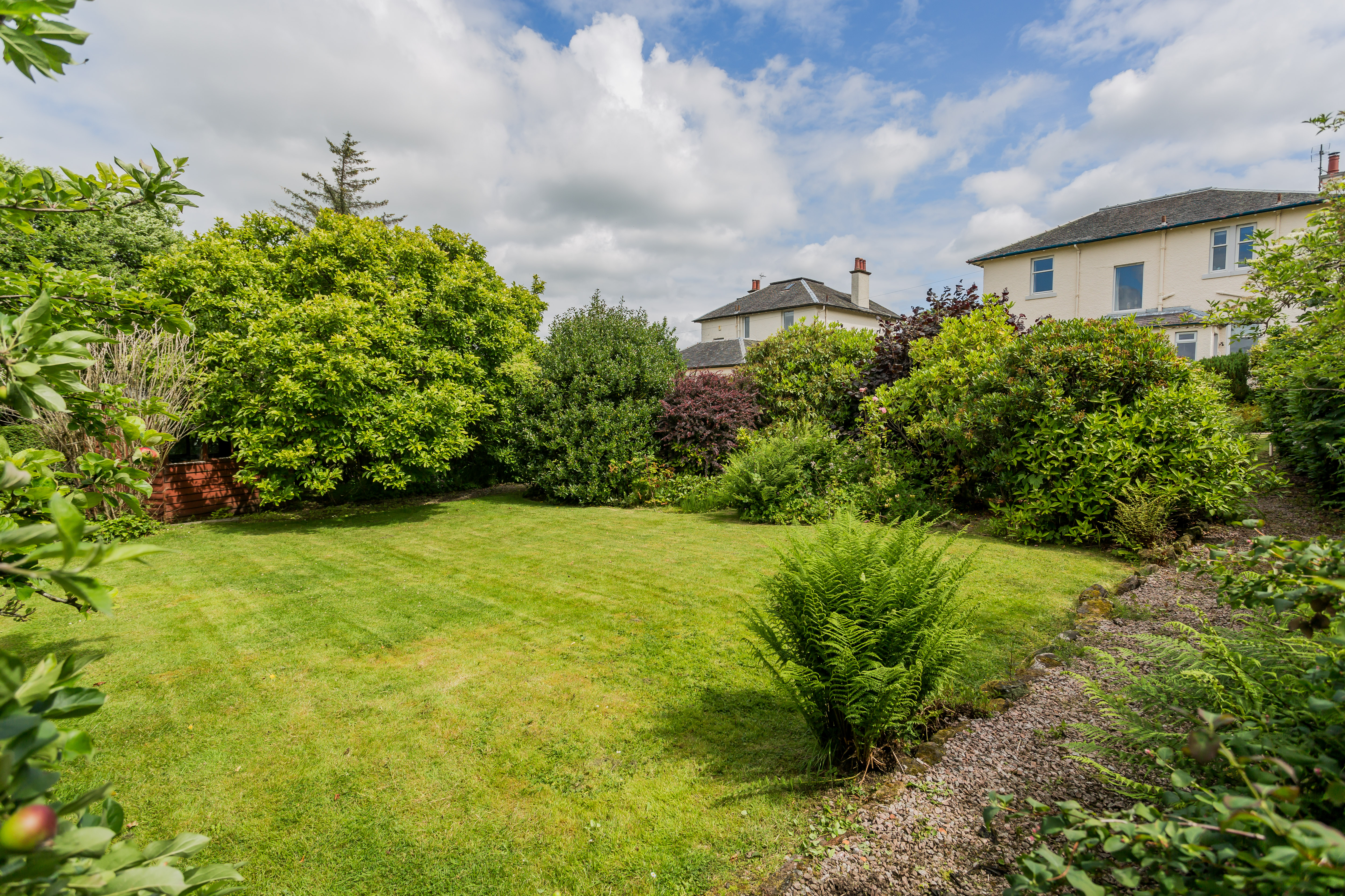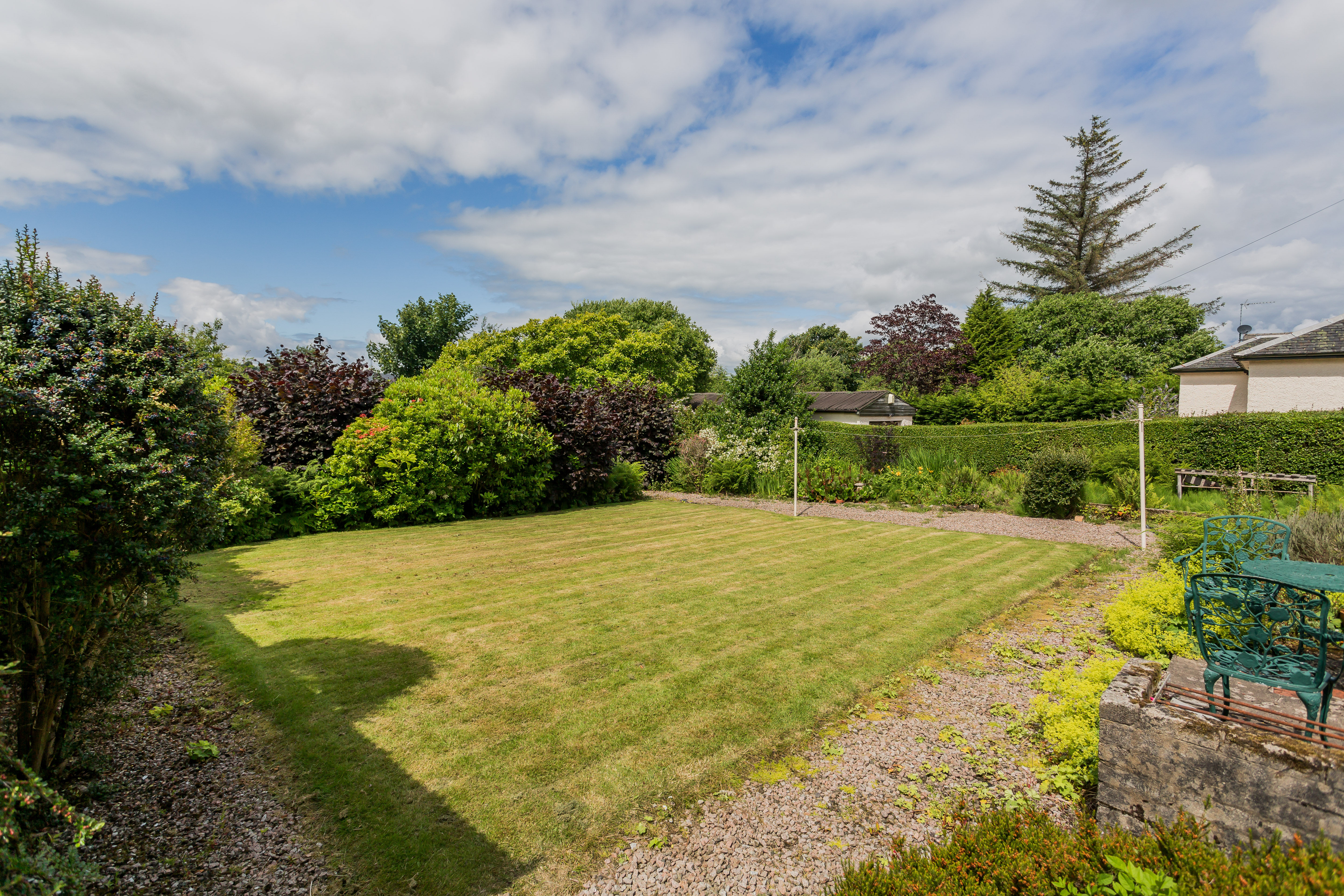 a stone chipped pathway. The lawn to the rear is separated into two sections with