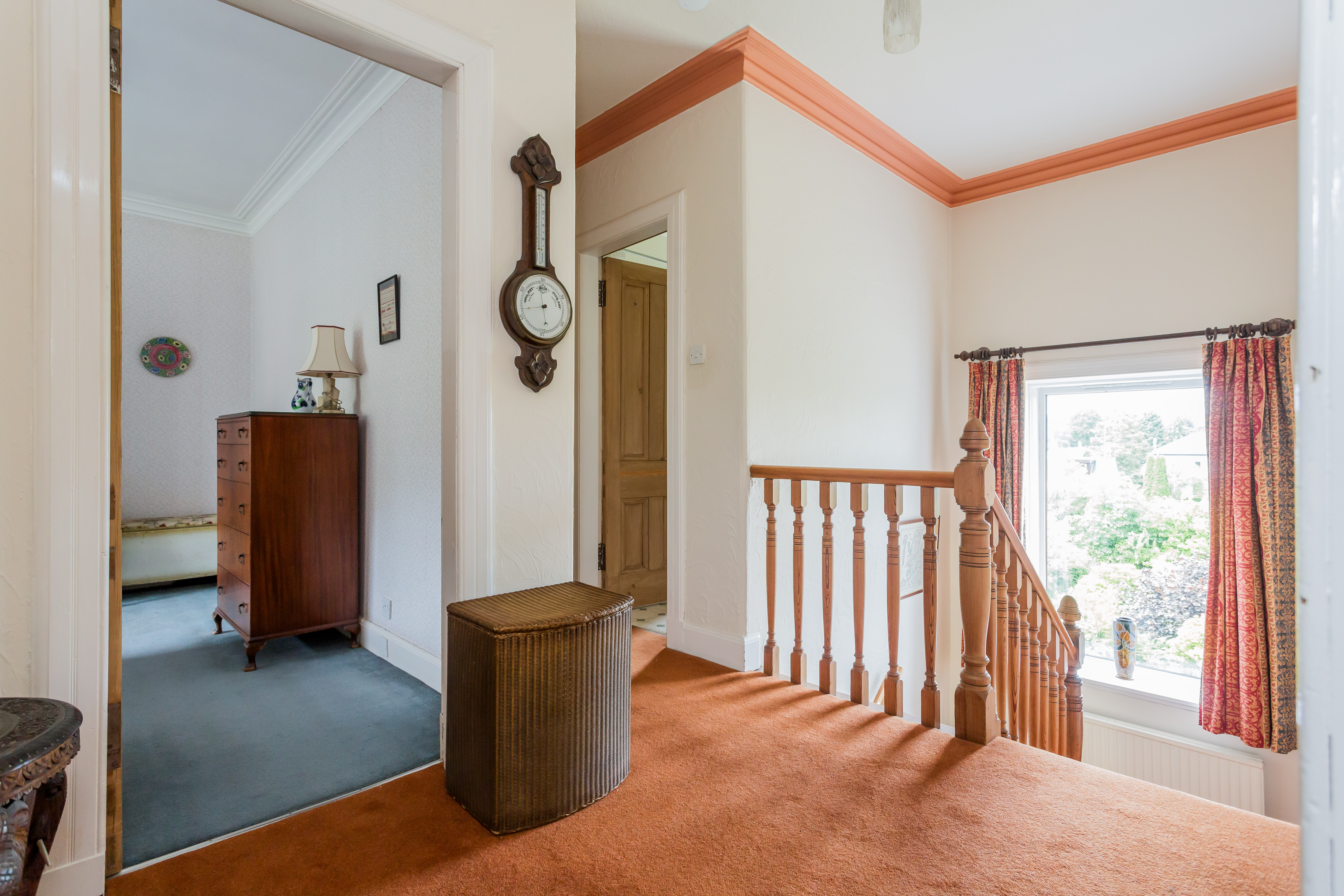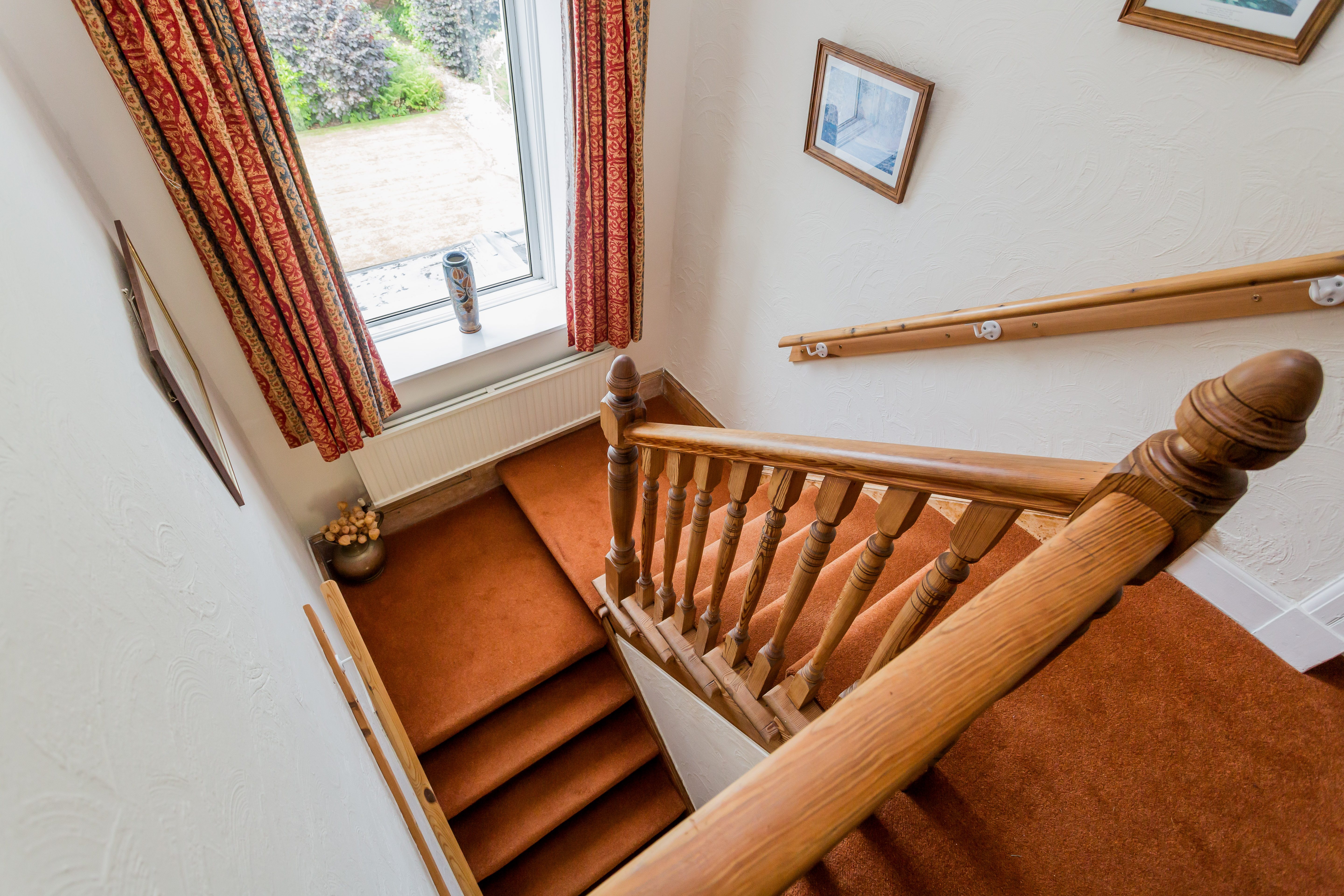 The carpeted stairwell leads to the first floor, passing the feature window on the