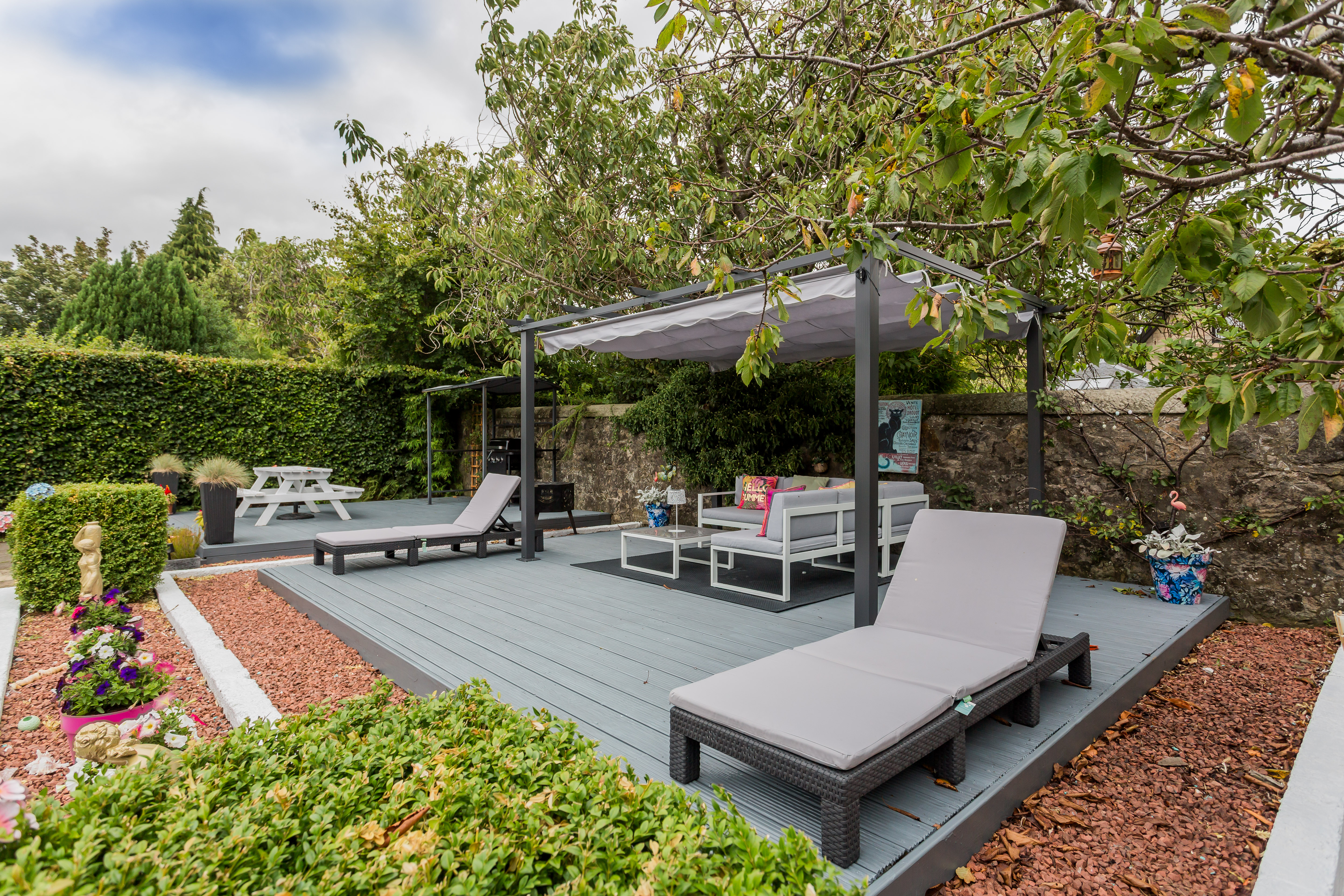 The seating area at the foot of the garden is perfect for enjoying the weather and social gatherings.