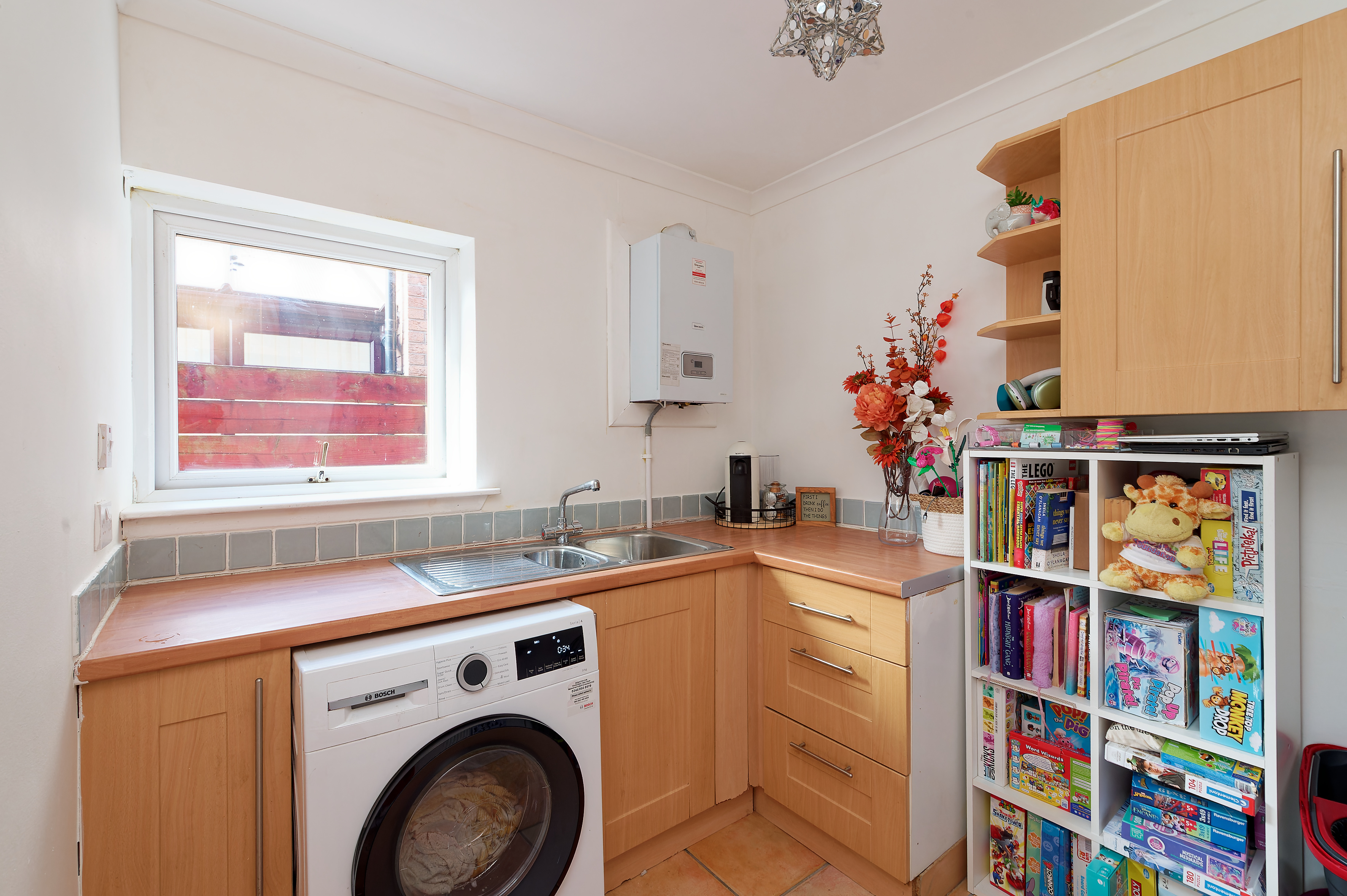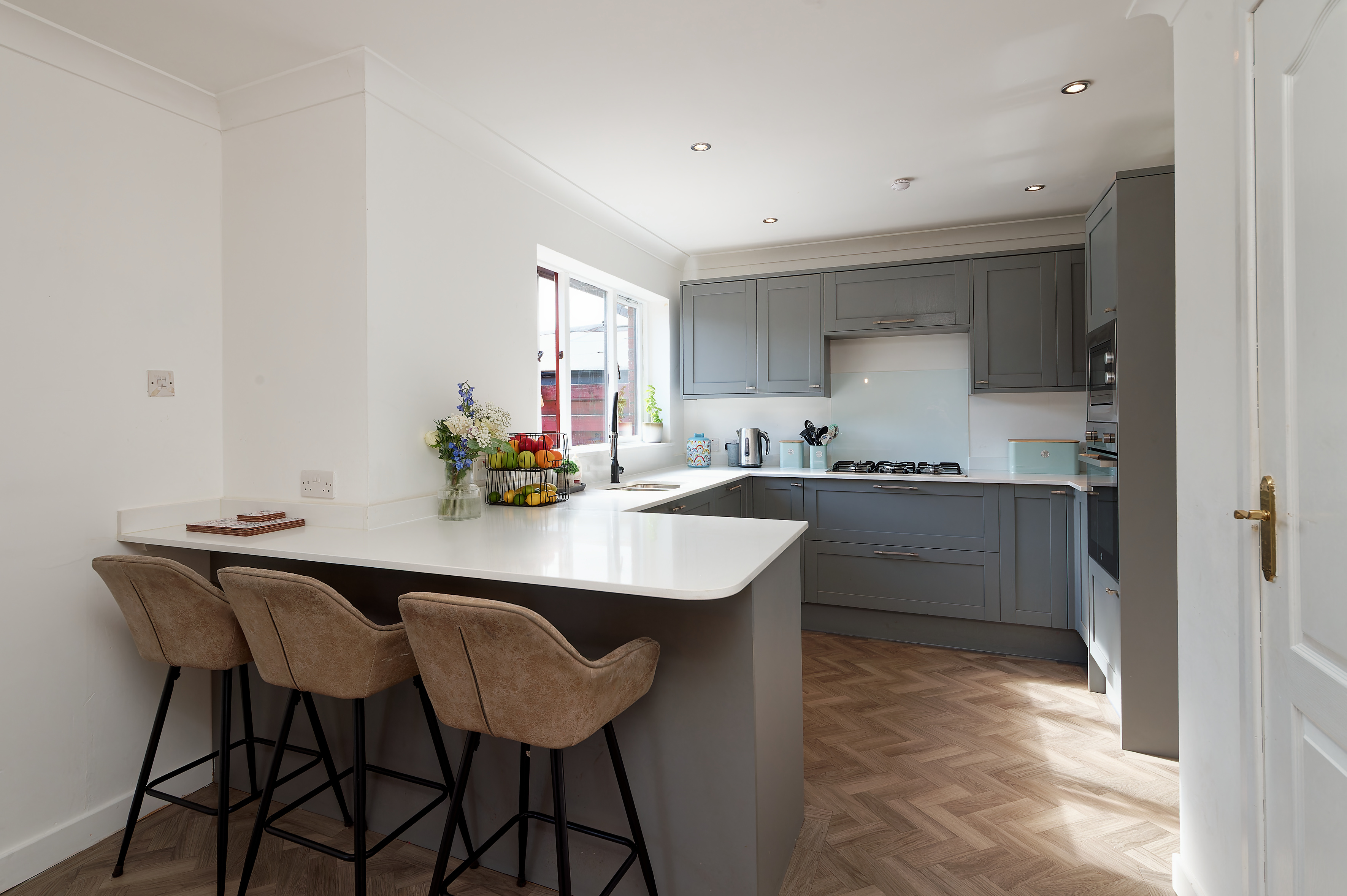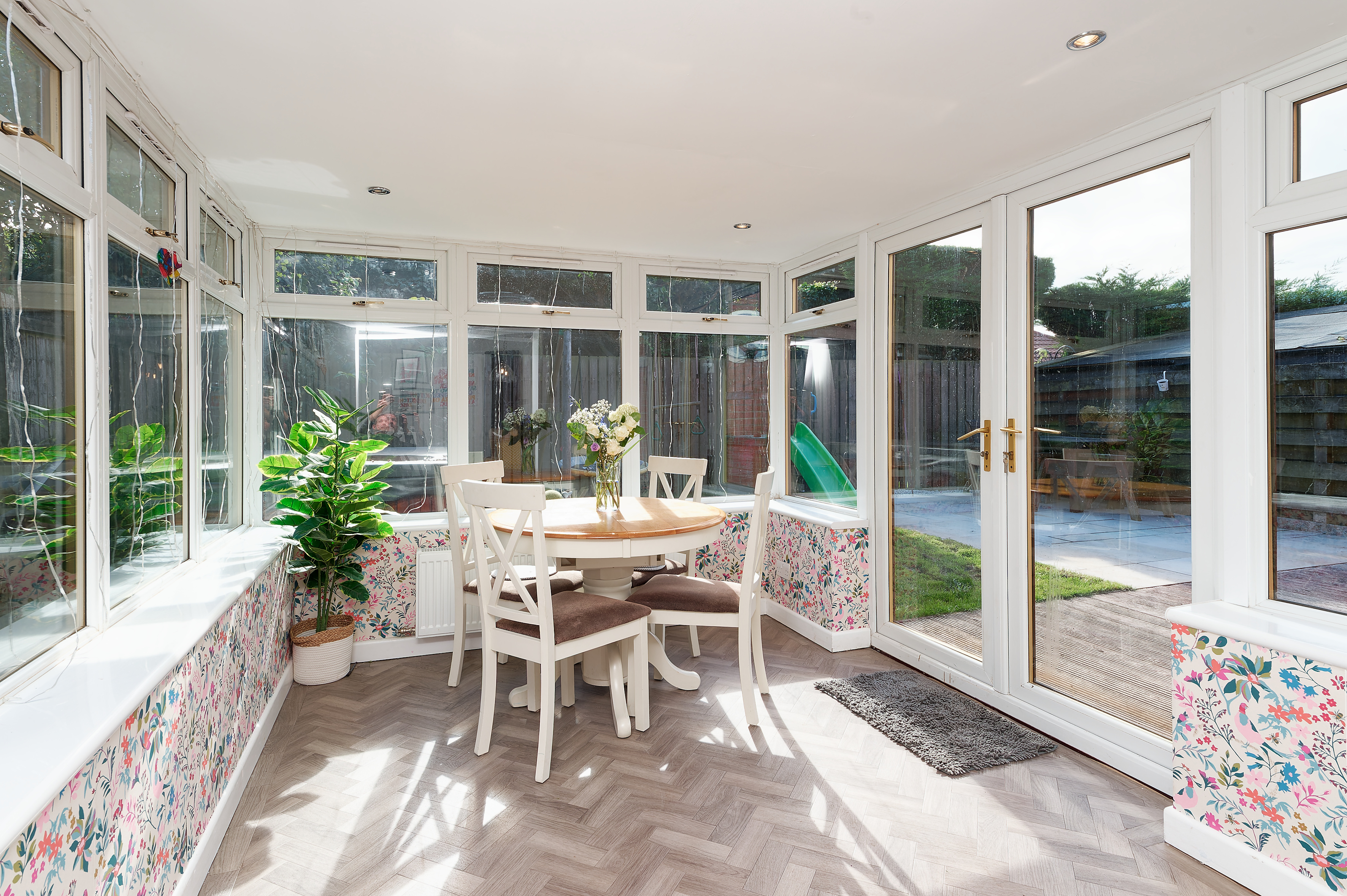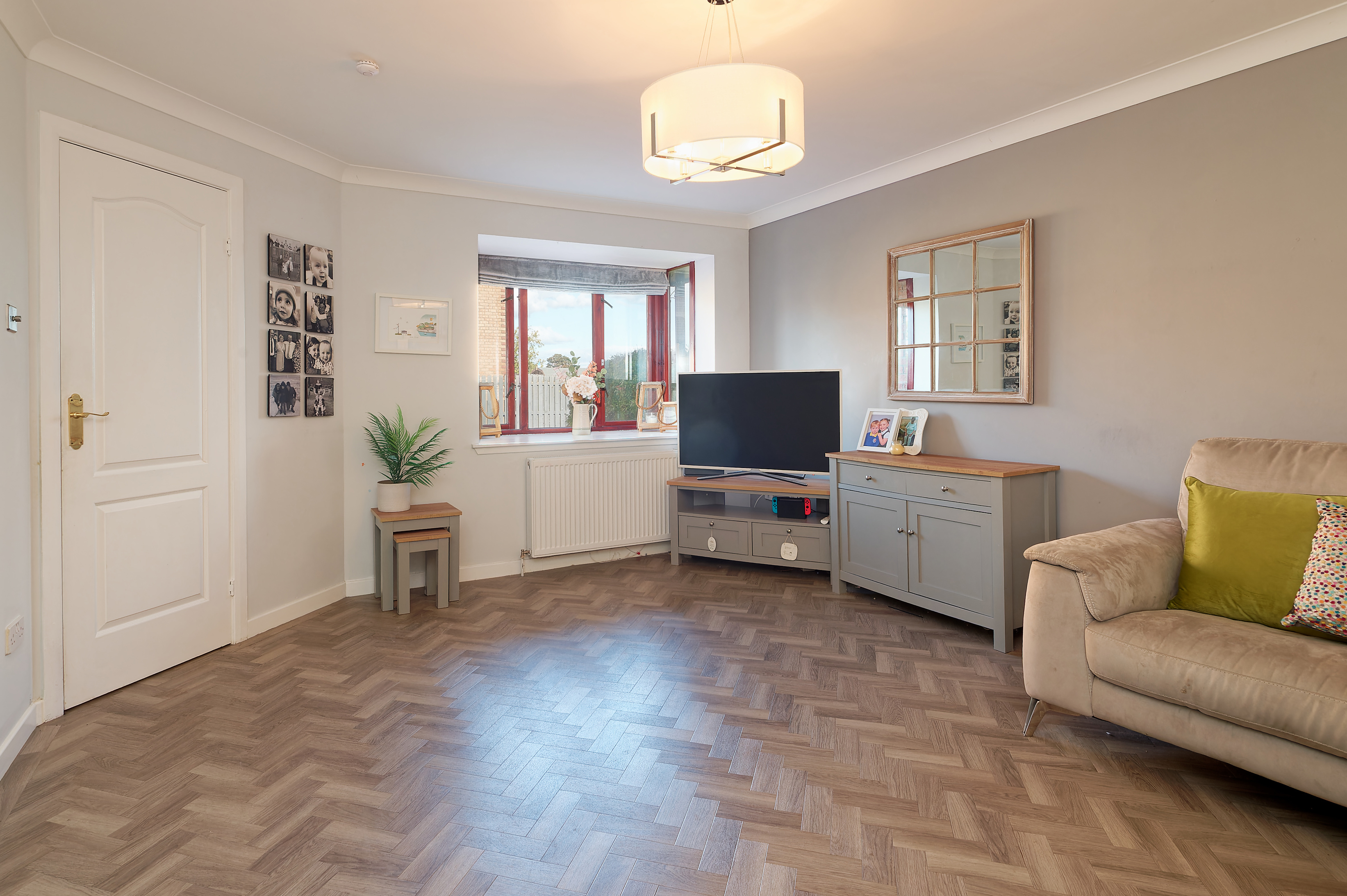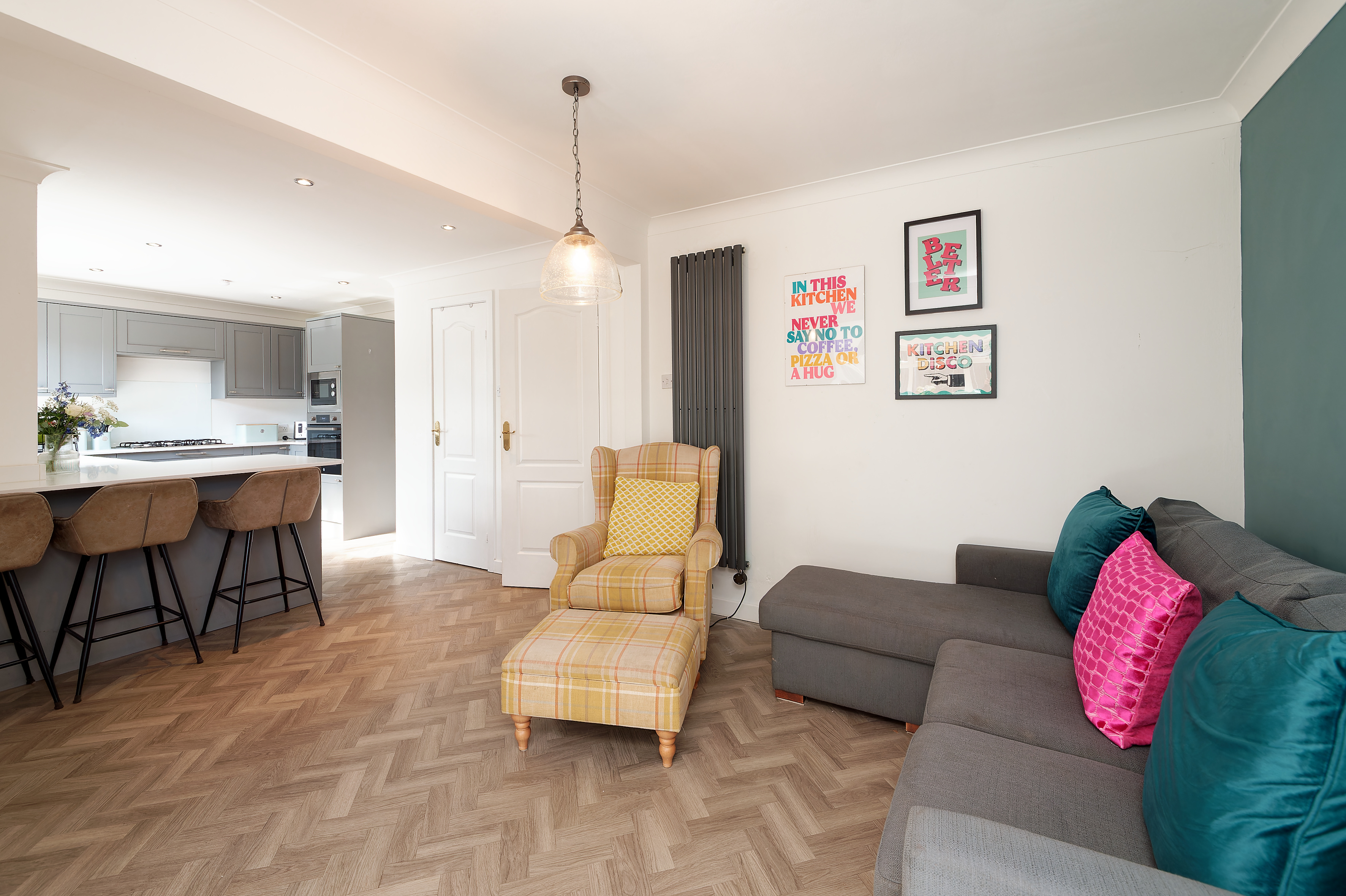 The reception hallway has a WC and gives access to a carpeted stairwell and the front facing lounge. This has a box bay window and Amtico Herringbone flooring. The fabulous breakfast kitchen also has space for a sitting area that is also open plan with a sun room to the rear. The kitchen is of a modern design with integrated appliances that include five burner hob as well as ample wall & base units with contrasting Quartz work surfaces. There is also a separate utility room with further storage and plumbing. The sun room is at the rear and overlooks the garden with access via a set of French doors.