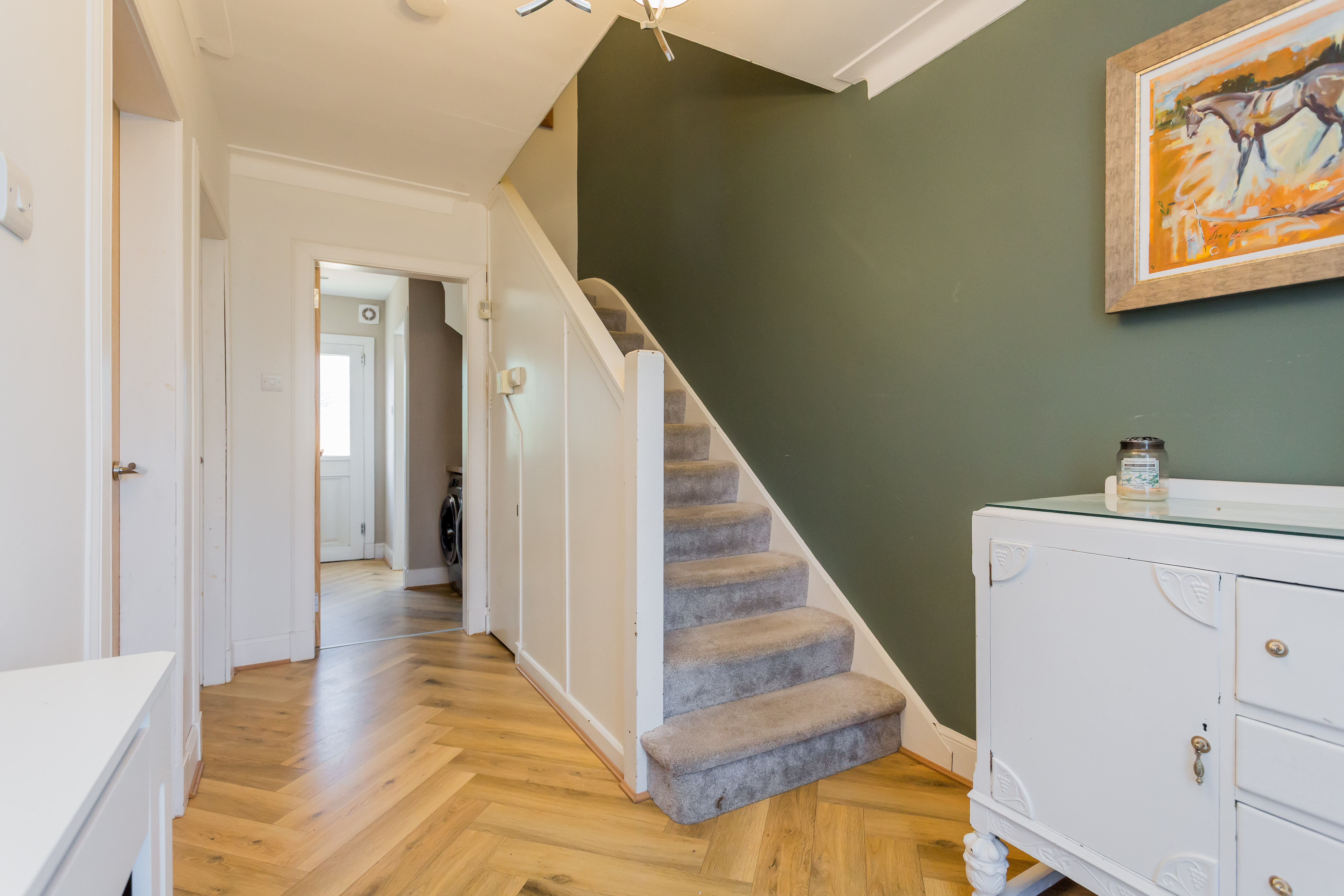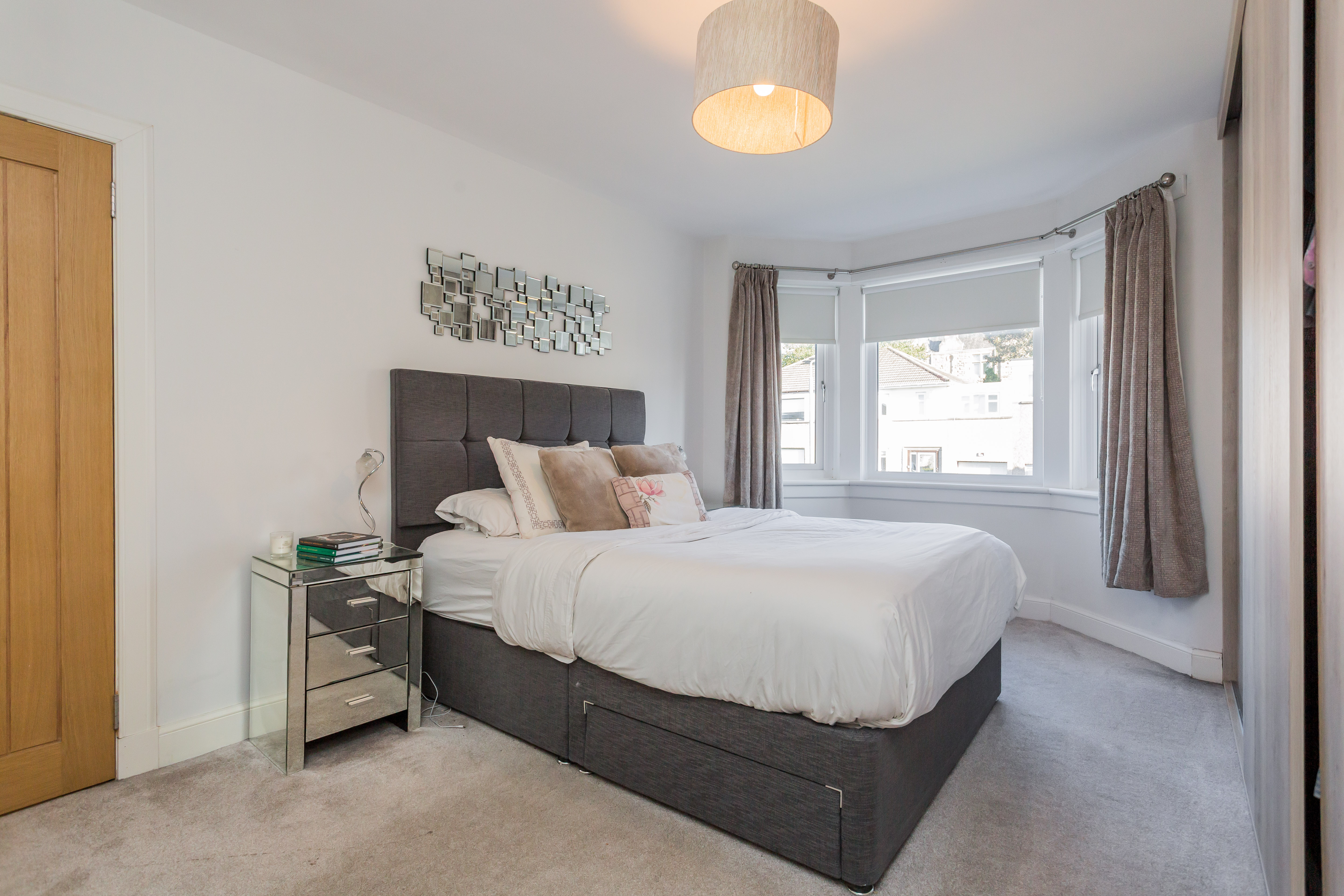 The carpeted stairwell leads to an upper hallway where there are three bedrooms and the contemporary designed and extended house bathroom that has a walk-in shower, separate bath, WC and wash hand basin The principal bedroom has the same half bay mirroring the lounge below with full length wardrobes.