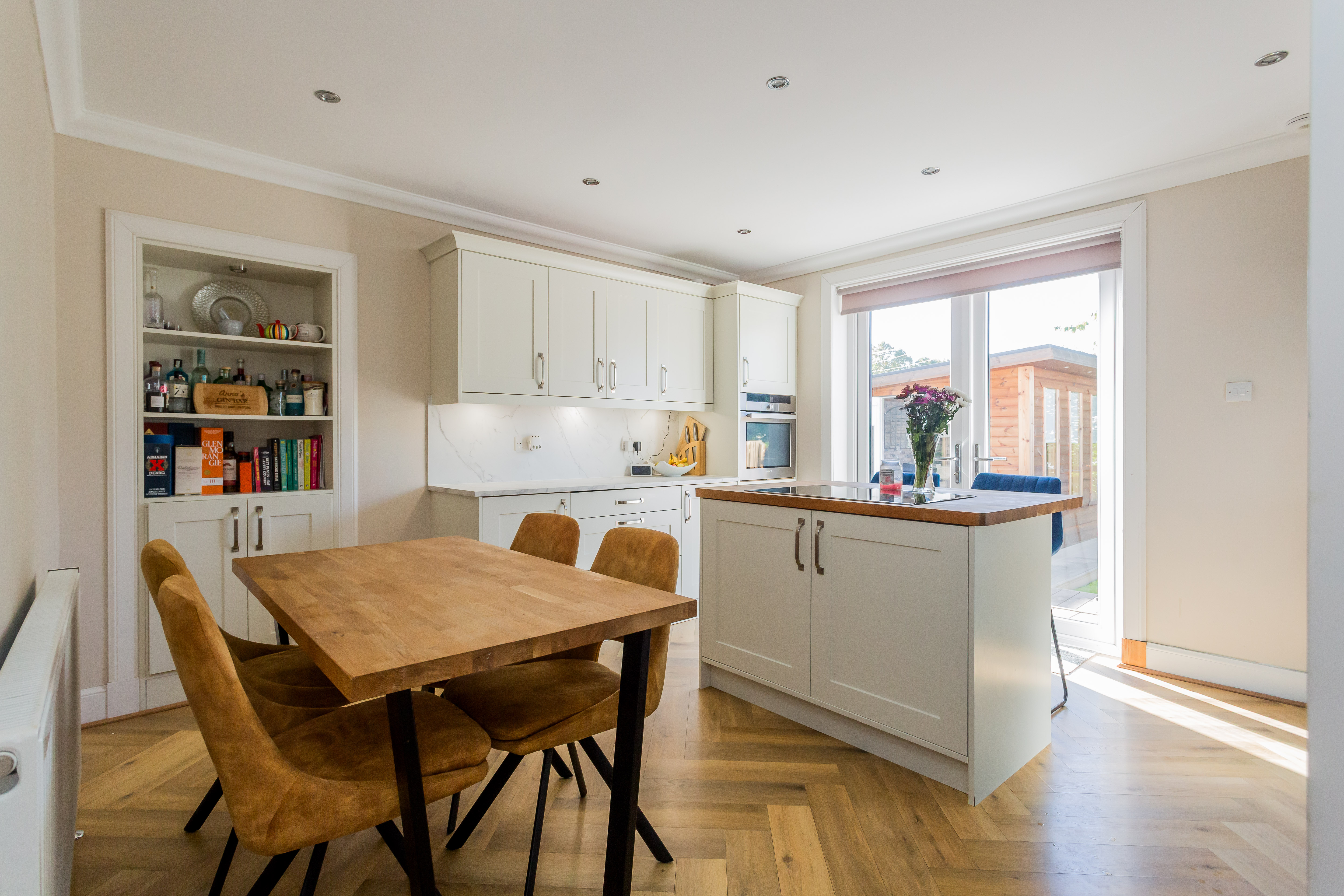 The reception hallway with stairwell has Herringbone flooring that carries through to the front facing bay window lounge. As part of the re-model the kitchen has been moved to what was the dining room to create a breakfast dining size kitchen that has wall & base units and a central island breakfast bar where the ceramic hob also sits. A set of French doors leads to the composite deck and garden. The former kitchen is now a very usable utility room with cloakroom off and a further Upvc door to the garden.