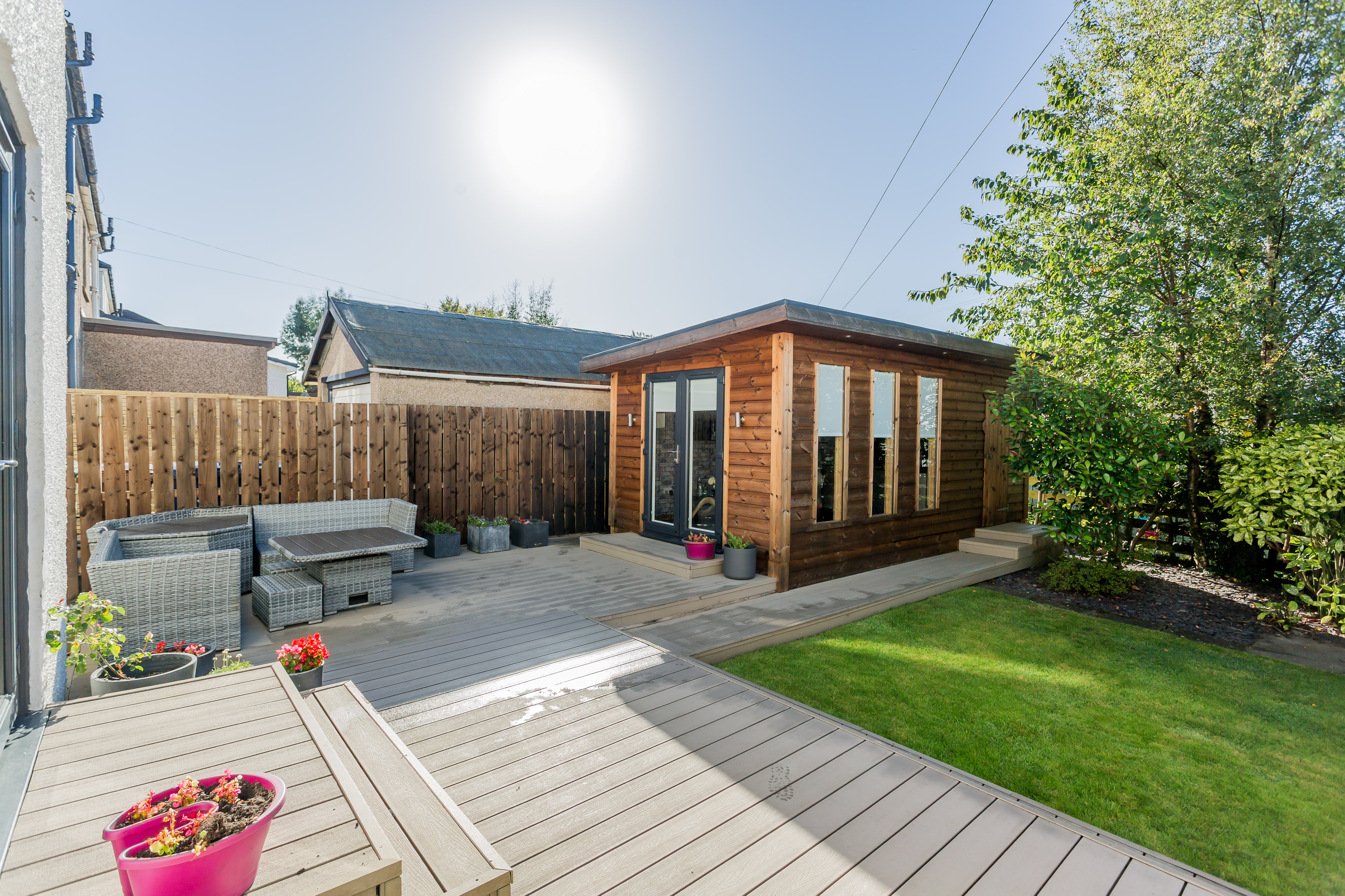 To the front is a slab driveway interspersed with stone chips The fantastic rear garden is on two levels with the composite deck immediately adjacent to the property that leads to the fantastic summer house that also has storage at the rear. There is also a level lawn and the garden is bordered by timber fencing and has the benefit of a south facing orientation.