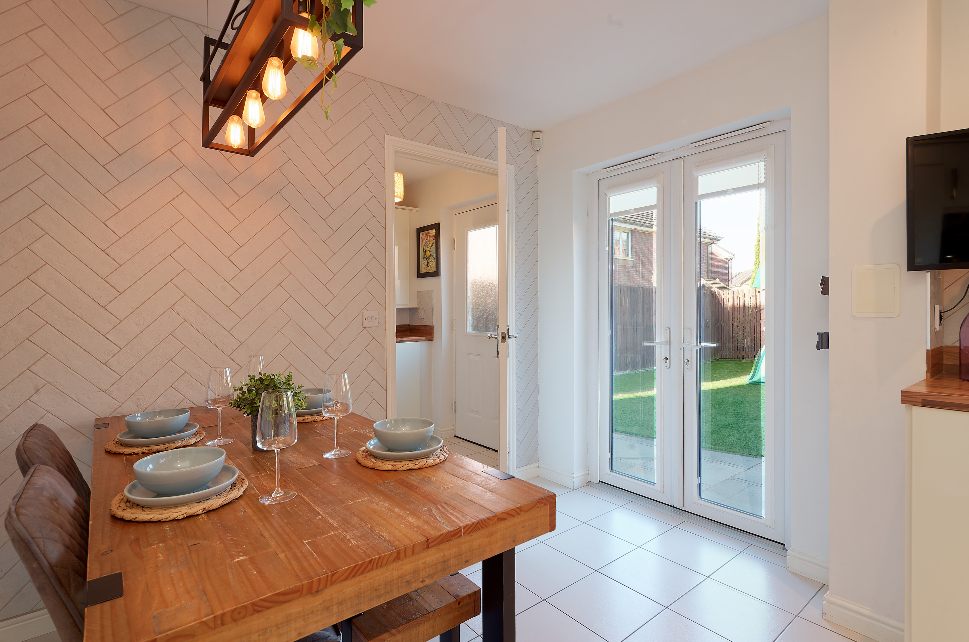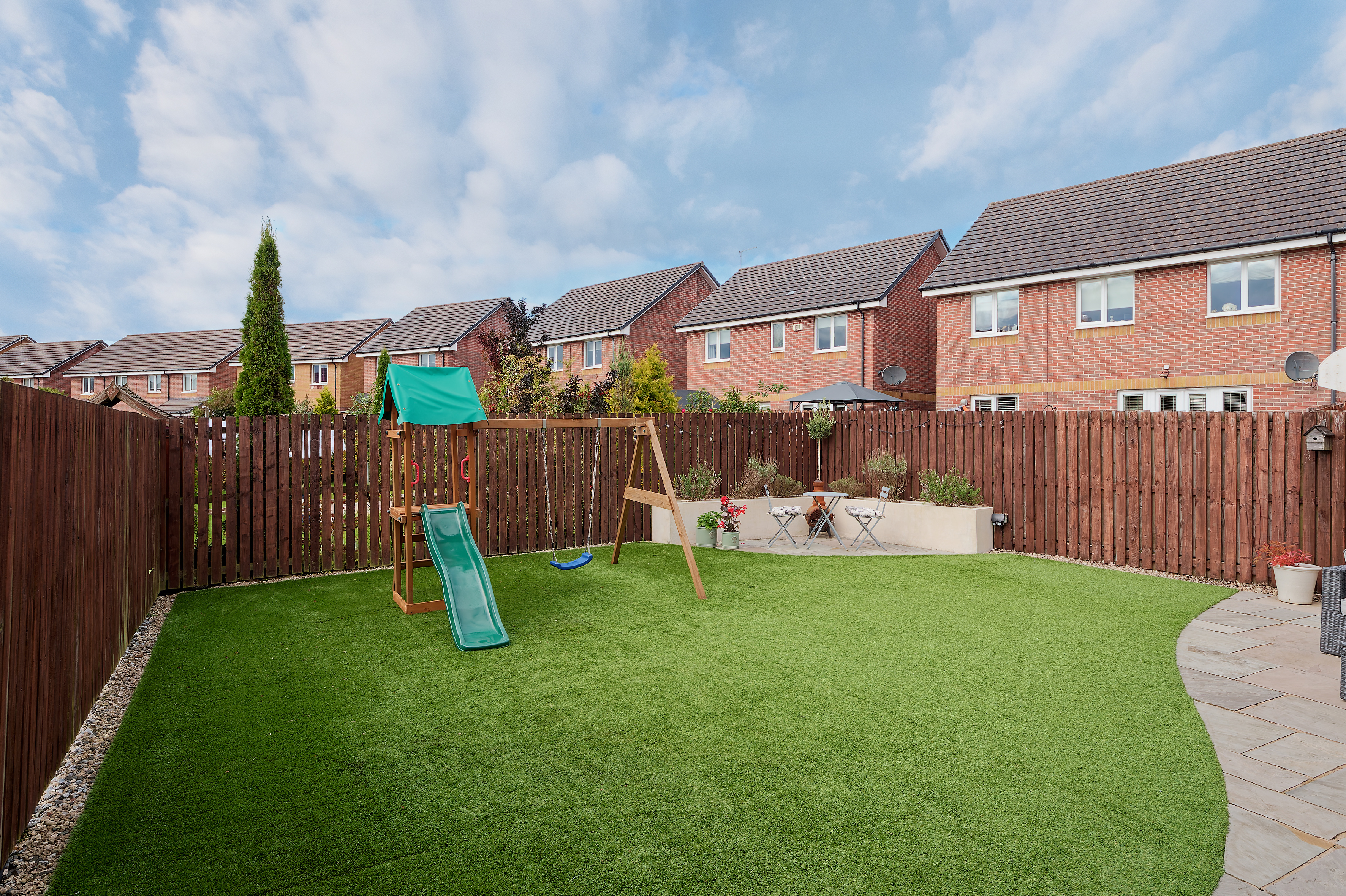 A real plus for this property is that it isn’t overlooked to the rear as it is adjacent residents’ gardens, a rarity in a modern estate. To the front there is a section of lawn with stone chipped driveway leading to the single attached garage. The fabulous rear garden is all enclosed with timber fencing, is level and has artificial grass and a sandstone patio on a south west orientation for alfresco dining.