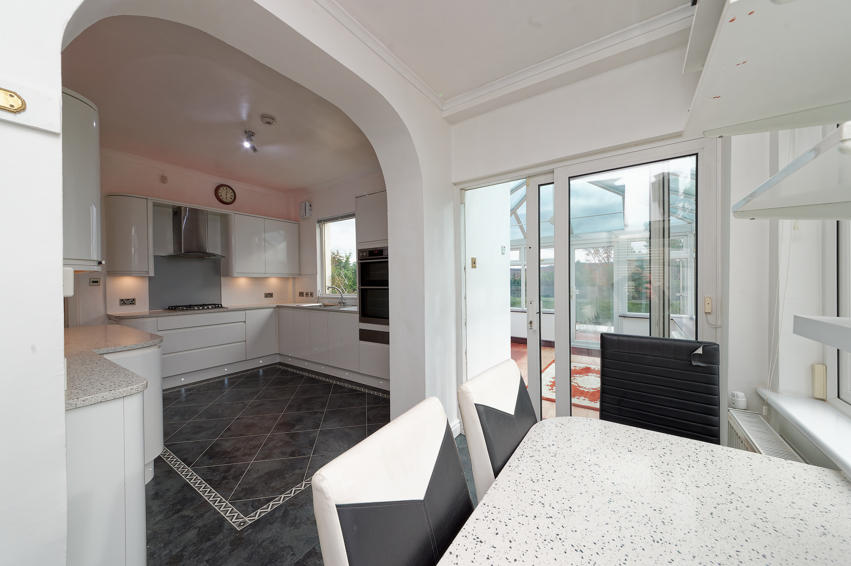The modern kitchen has high gloss wall & base units with integrated appliances that include oven, hob and extractor hood. There is also a recess matching the dining room recess with space for dining which also shares the same open aspects. A door form here leads to a conservatory that in turn has access to the gardens.