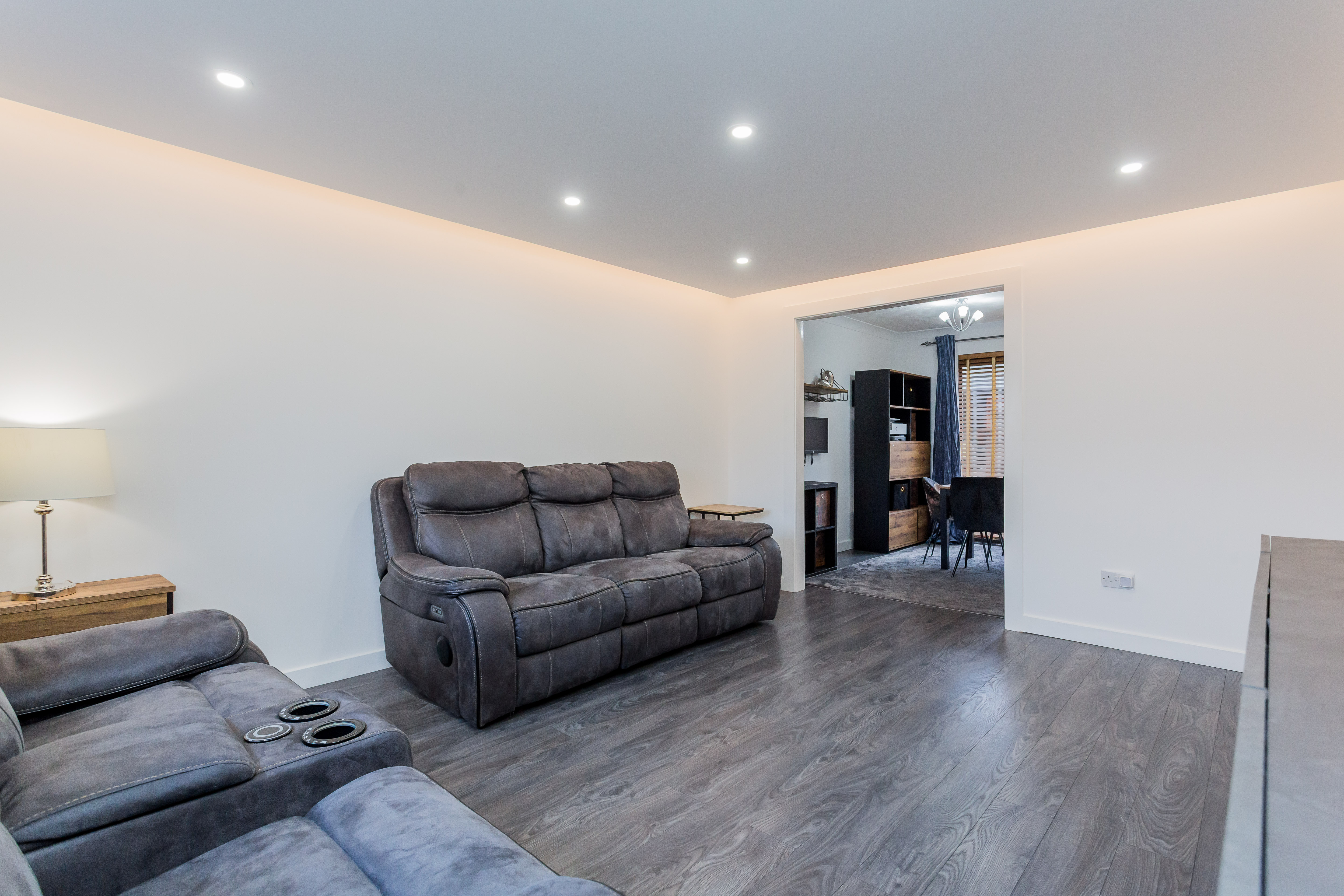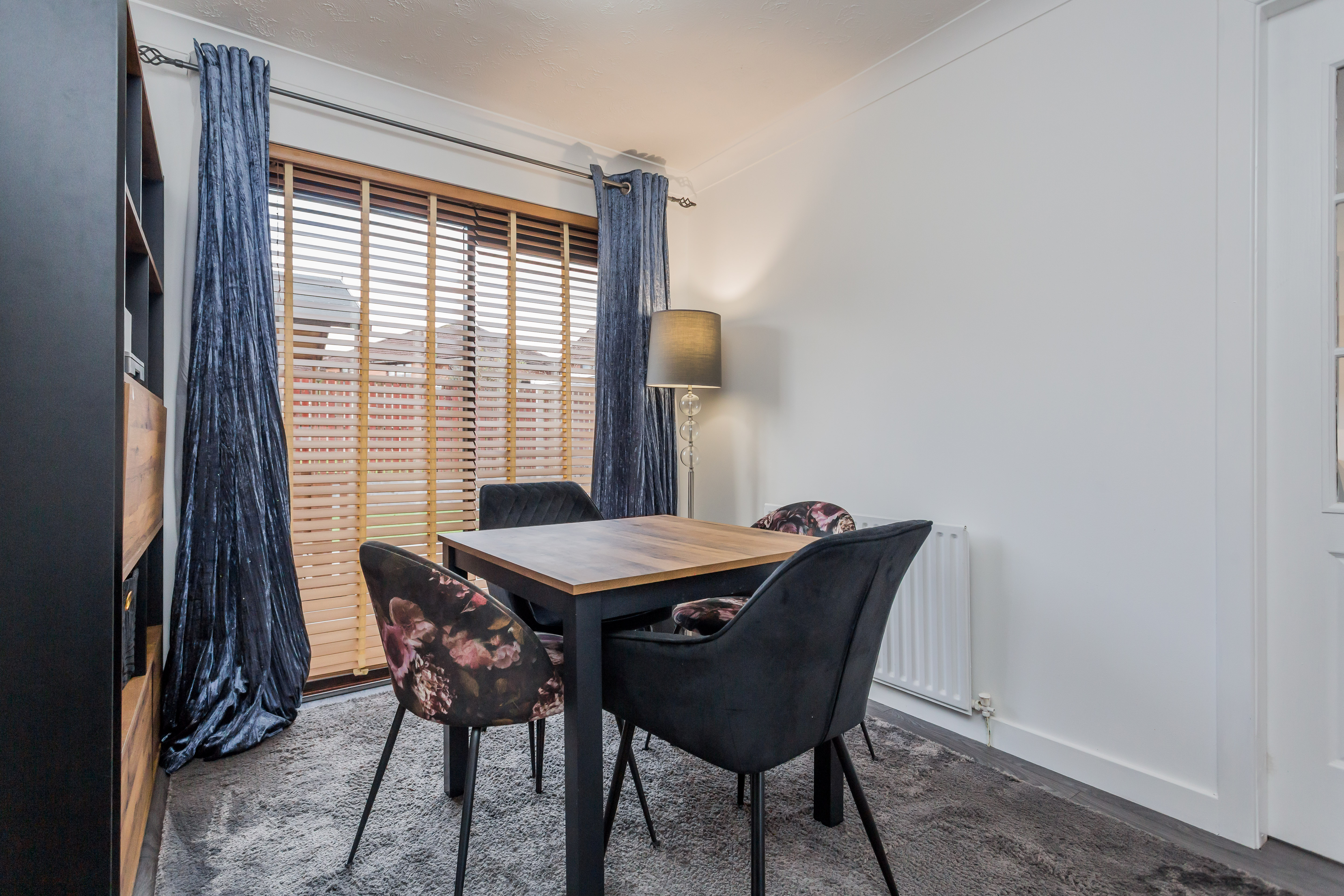 Bright, welcoming entrance hallway with convenient ground-floor WCSpacious front lounge filled with natural light and flowing seamlessly into the dining roomFormal dining room with patio doors leading directly to the rear garden — perfect for family meals and summer entertainingModern fitted kitchen with ample storage and space for everyday appliancesLarge utility room with space for laundry goods, access to the rear garden and direct entry into the integral garageThree well-proportioned bedrooms on the upper level:Bedroom One and Bedroom Two with fitted wardrobesBedroom Three with a built-in store cupboardFamily bathroomGas central heating (GCH) and double glazing (D/G) throughout
